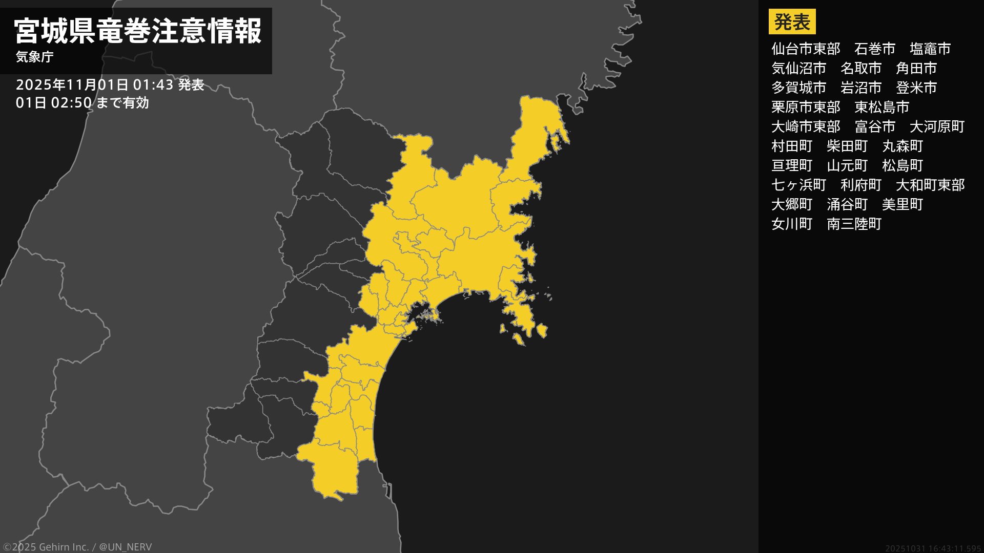 【宮城県 気象警報・注意報 2025年11月01日 01:41】東部では、土砂災害や低い土地の浸水、河川の増水、高波に警戒してください。宮城県では、暴風に警戒してください。#気象警報注意報 #宮城県