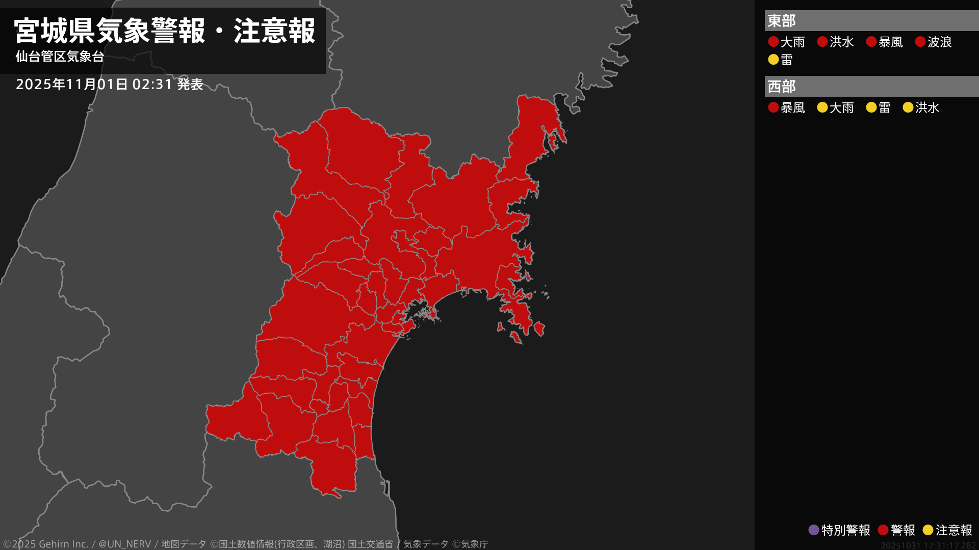 【宮城県 気象警報・注意報 2025年11月01日 02:31】東部では、土砂災害や低い土地の浸水、河川の増水、高波に警戒してください。宮城県では、暴風に警戒してください。#気象警報注意報 #宮城県