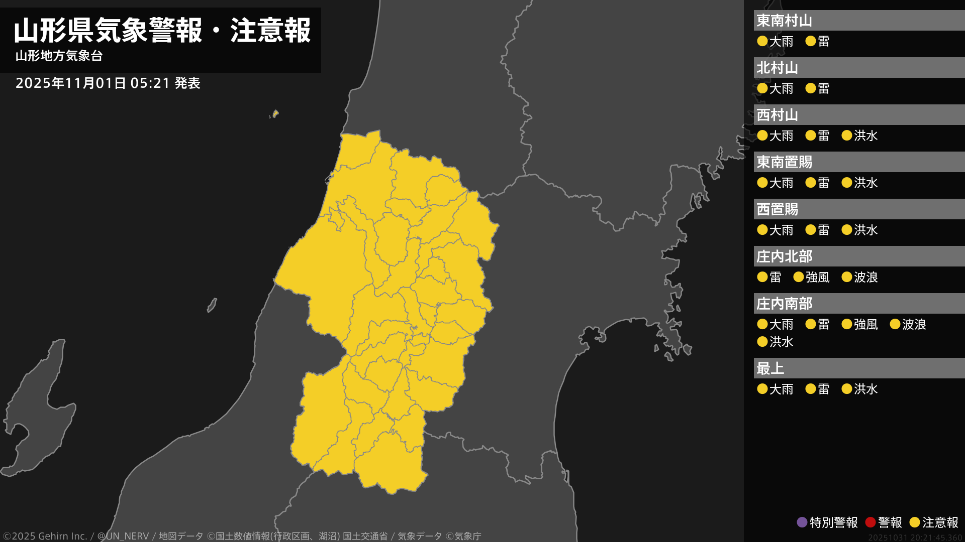【山形県 気象警報・注意報 2025年11月01日 05:21】山形県では、土砂災害や河川の増水、落雷に注意してください。村山、庄内では、低い土地の浸水に注意してください。庄内では、強風や高波に注意してください。#気象警報注意報 #山形県