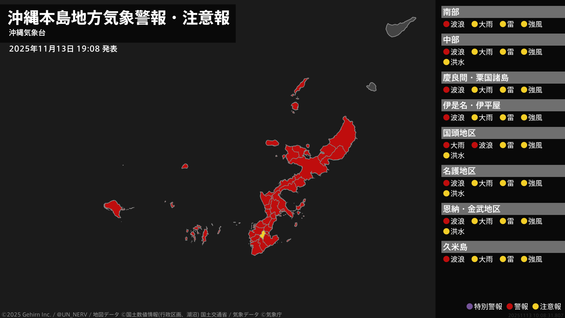 【沖縄本島地方 気象警報・注意報 2025年11月13日 19:08】