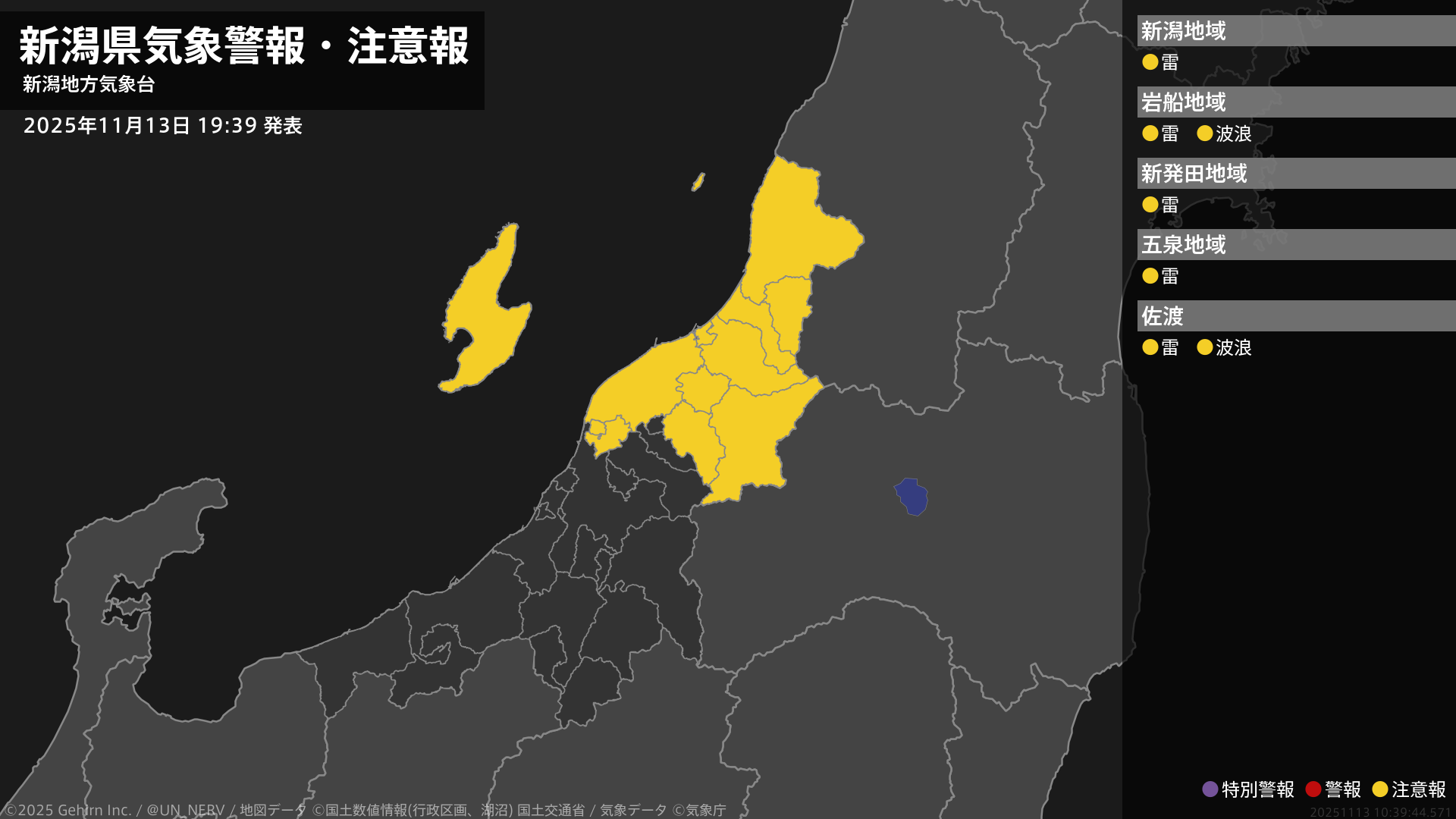 【新潟県 気象警報・注意報 2025年11月13日 19:39】