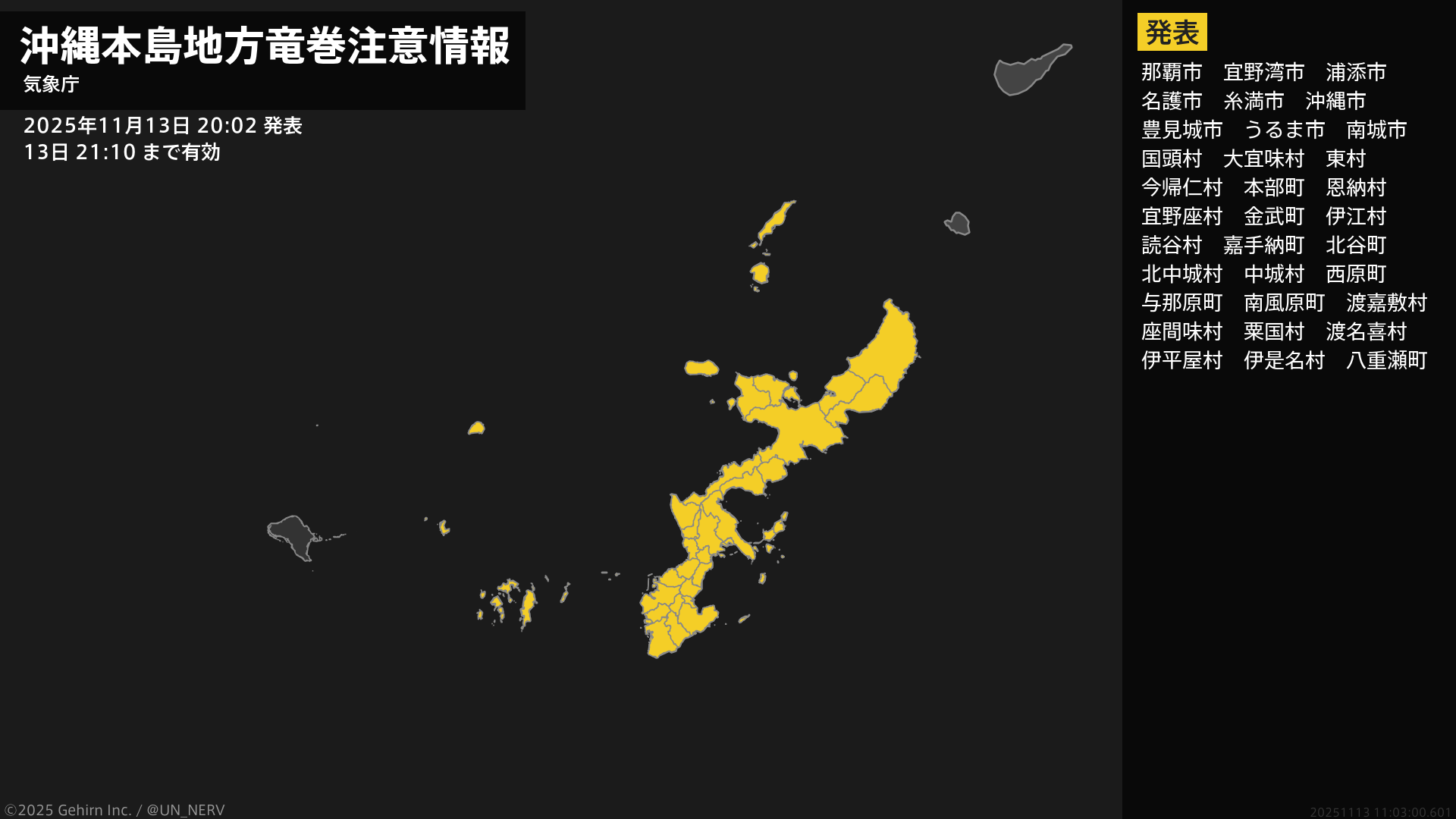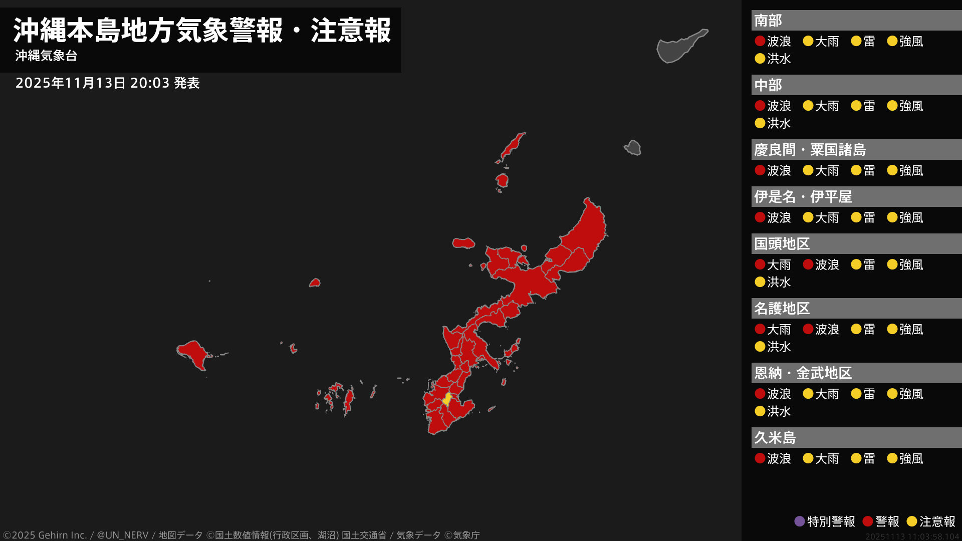 【沖縄本島地方 気象警報・注意報 2025年11月13日 20:03】