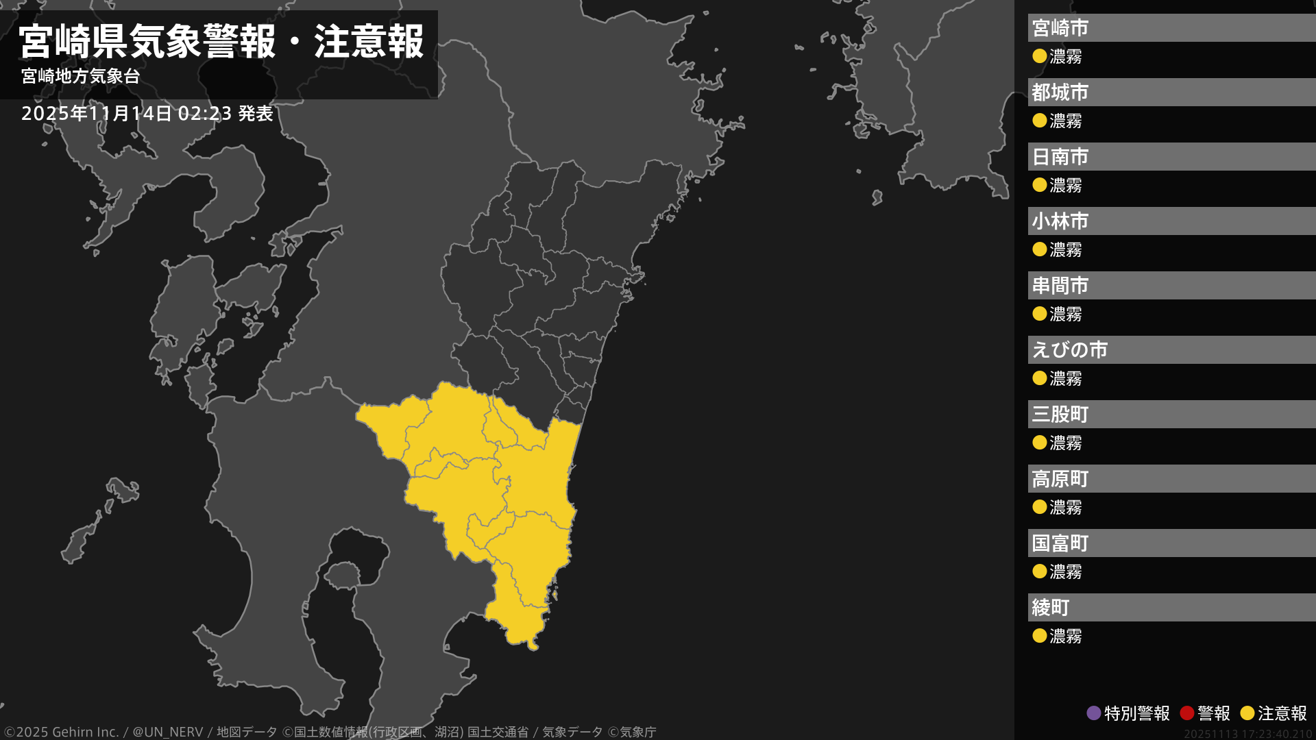 【宮崎県 気象警報・注意報 2025年11月14日 02:23】南部平野部、南部山沿いでは、14日朝まで濃霧による視程障害に注意してください。#気象警報注意報 #宮崎県