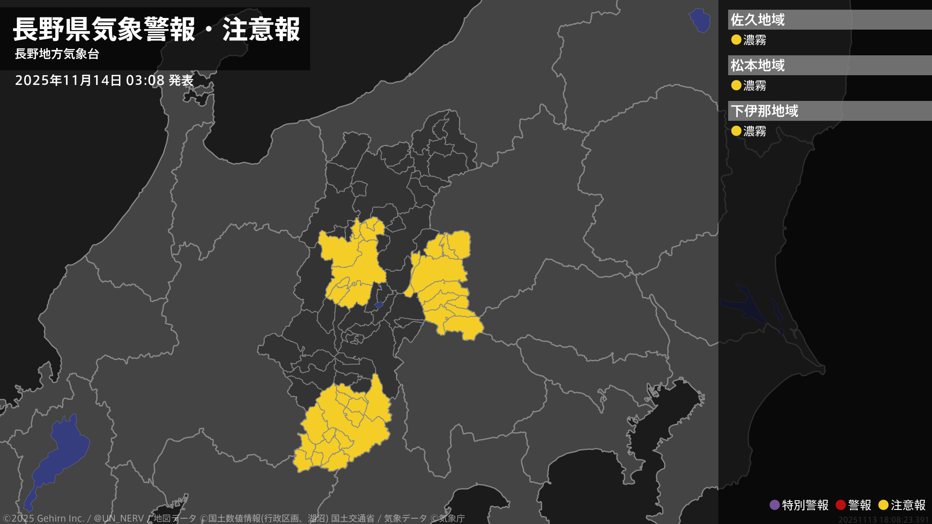 【長野県 気象警報・注意報 2025年11月14日 03:08】中部、南部では、14日昼前まで濃霧による視程障害に注意してください。#気象警報注意報 #長野県