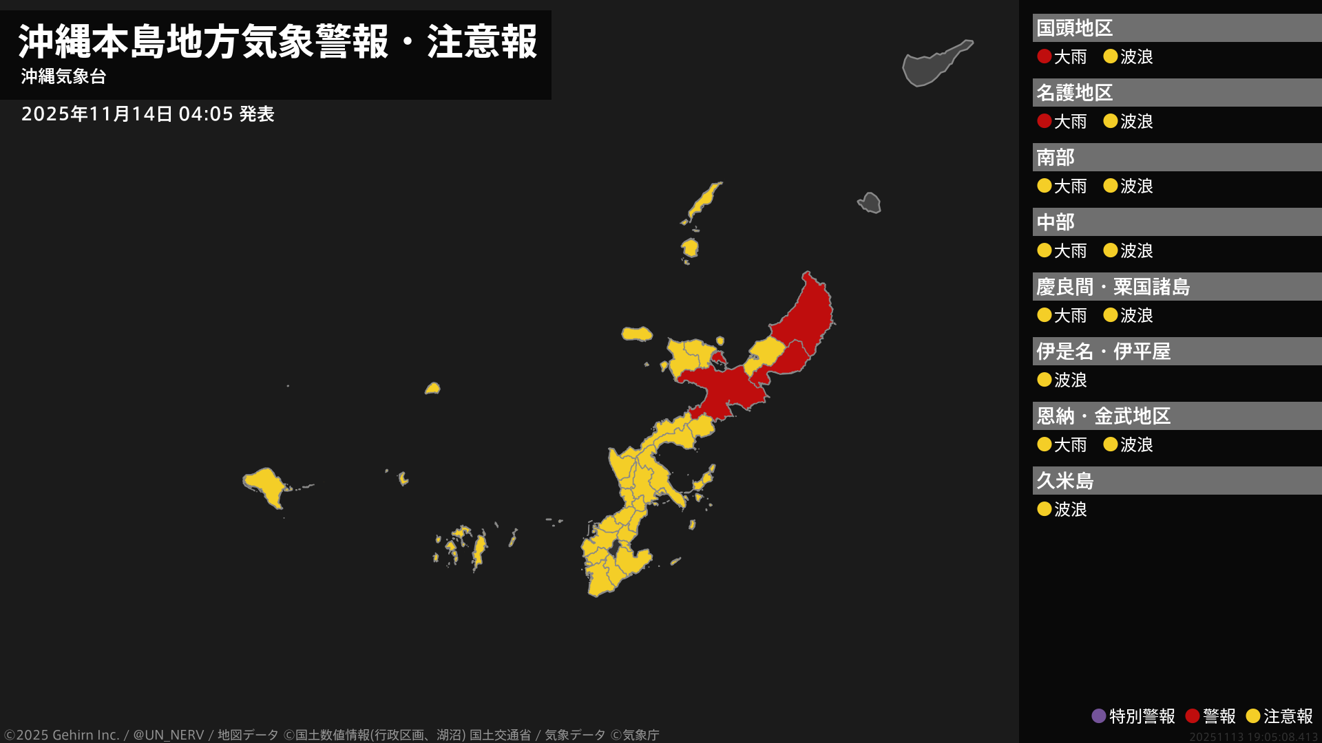 【沖縄本島地方 気象警報・注意報 2025年11月14日 04:05】本島北部では、14日昼前まで土砂災害に警戒してください。#気象警報注意報 #沖縄本島地方
