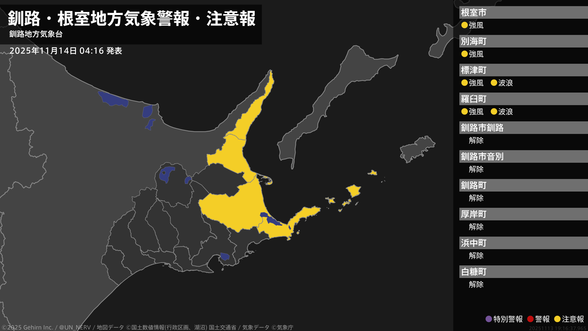 【釧路・根室地方 気象警報・注意報 2025年11月14日 04:16】根室地方では、14日昼前まで強風に、15日明け方まで高波に注意してください。#気象警報注意報 #根室地方 #釧路地方