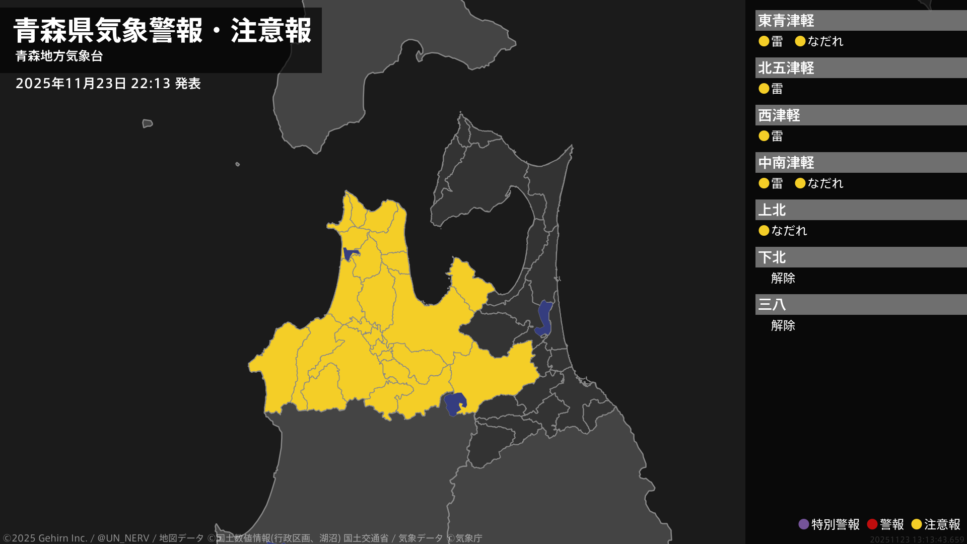 【青森県 気象警報・注意報 2025年11月23日 22:13】津軽では、24日明け方まで急な強い雨や落雷に注意してください。津軽、三八上北では、25日までなだれに注意してください。#気象警報注意報 #青森県