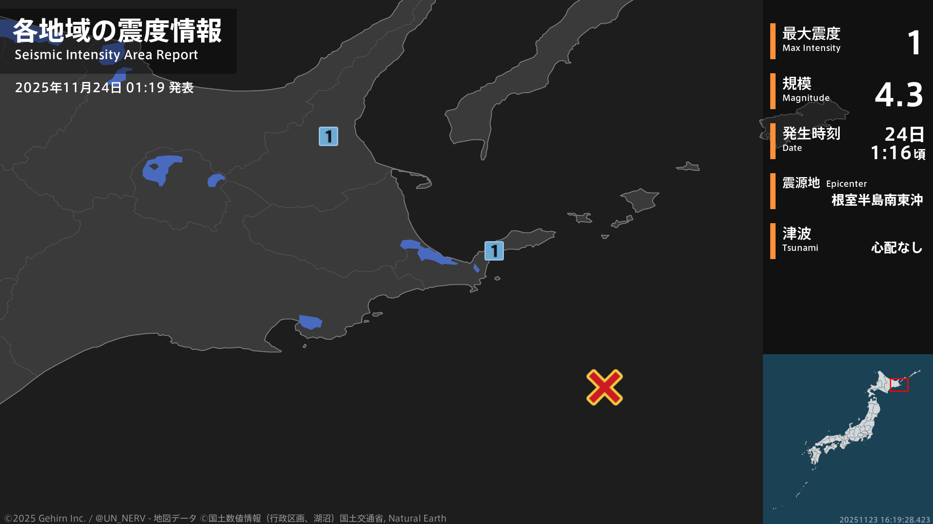 【地震情報 2025年11月24日】1時16分頃、根室半島南東沖を震源とする地震がありました。震源の深さは約10km、地震の規模はM4.3、最大震度1を北海道で観測しています。この地震による津波の心配はありません。#地震 #北海道