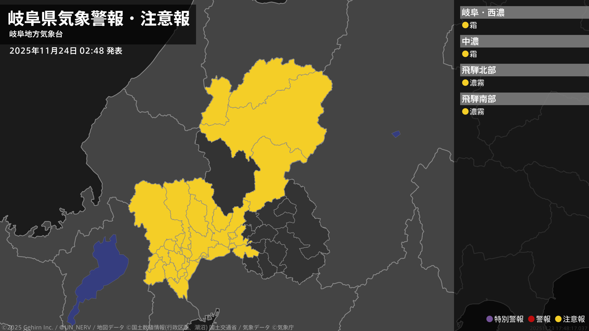 【岐阜県 気象警報・注意報 2025年11月24日 02:48】飛騨地方では、24日昼前まで濃霧による視程障害に注意してください。美濃地方では、24日朝は霜に対する農作物の管理に注意してください。#気象警報注意報 #岐阜県