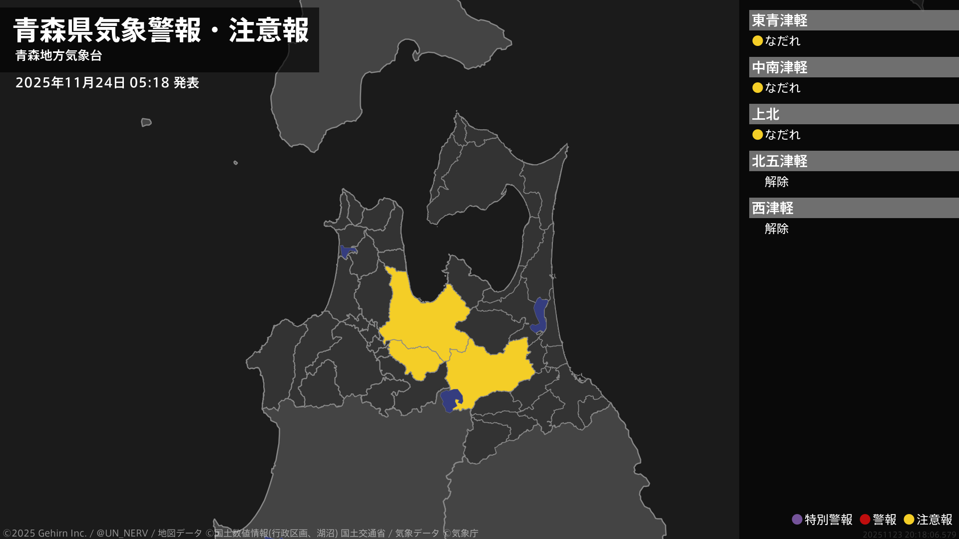 【青森県 気象警報・注意報 2025年11月24日 05:18】