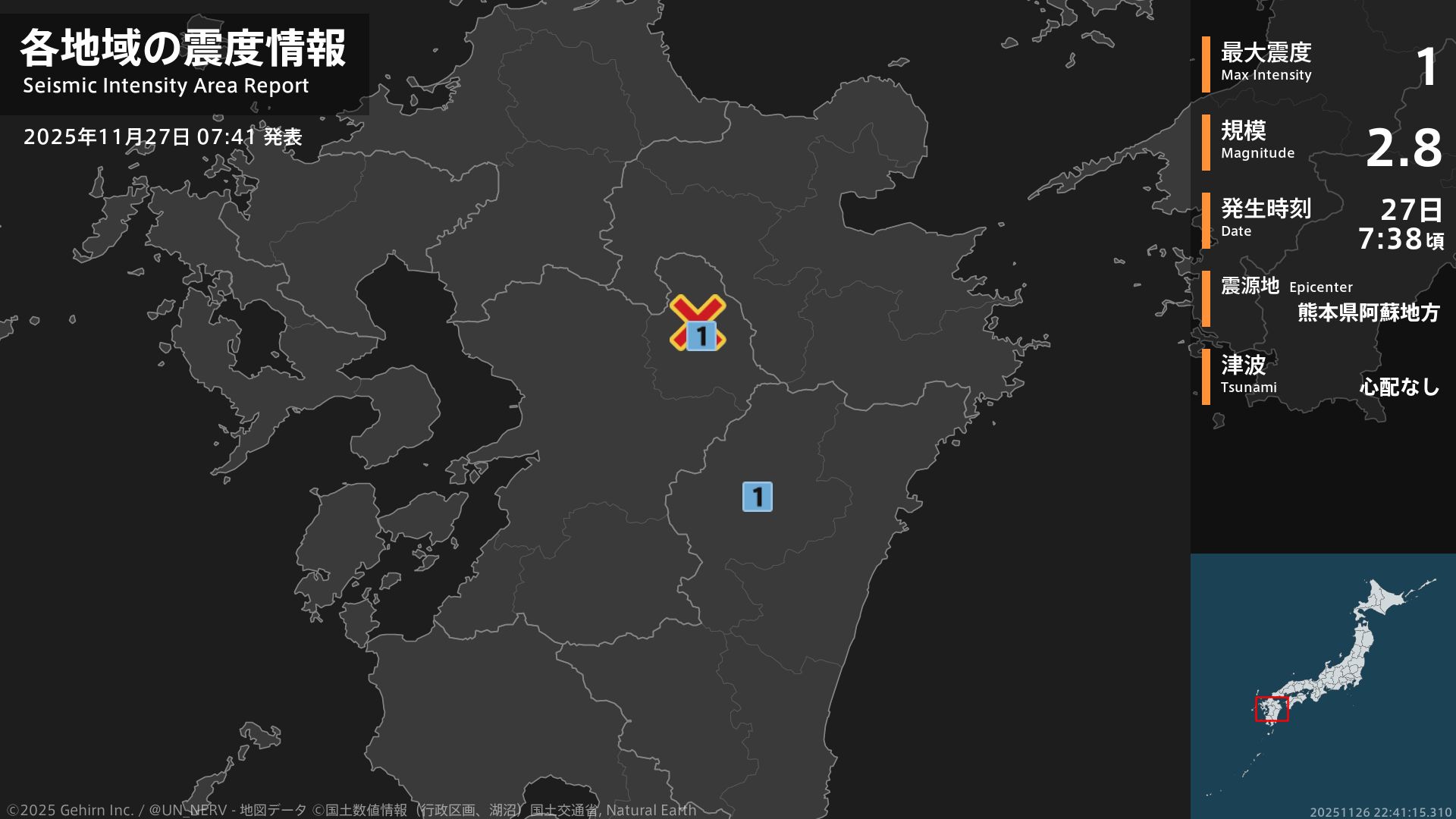 【地震情報 2025年11月27日】7時38分頃、熊本県阿蘇地方を震源とする地震がありました。震源の深さは約10km、地震の規模はM2.8、最大震度1を熊本県、宮崎県で観測しています。この地震による津波の心配はありません。#地震 #熊本県 #宮崎県