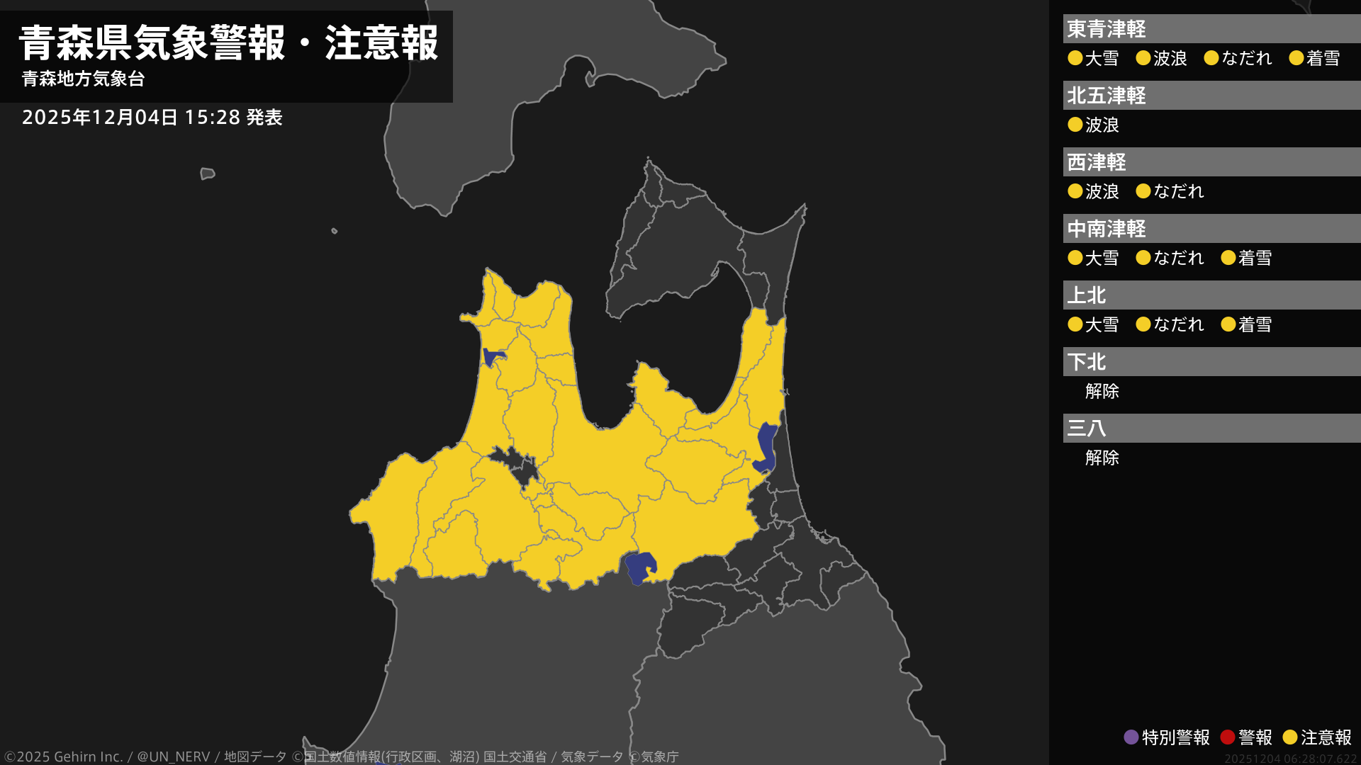 【青森県 気象警報・注意報 2025年12月04日 15:28】