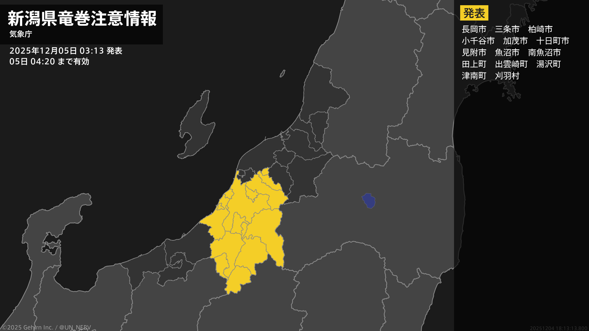 【新潟県 気象警報・注意報 2025年12月05日 02:26】中越では、土砂災害に注意してください。新潟県では、強風や高波、竜巻などの激しい突風、落雷に注意してください。#気象警報注意報 #新潟県