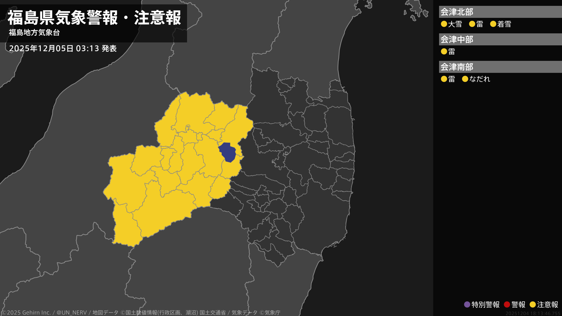 【福島県 気象警報・注意報 2025年12月05日 03:13】会津では、5日昼前まで大雪や電線等への着雪に、5日夕方まで落雷に、5日までなだれに注意してください。#気象警報注意報 #福島県