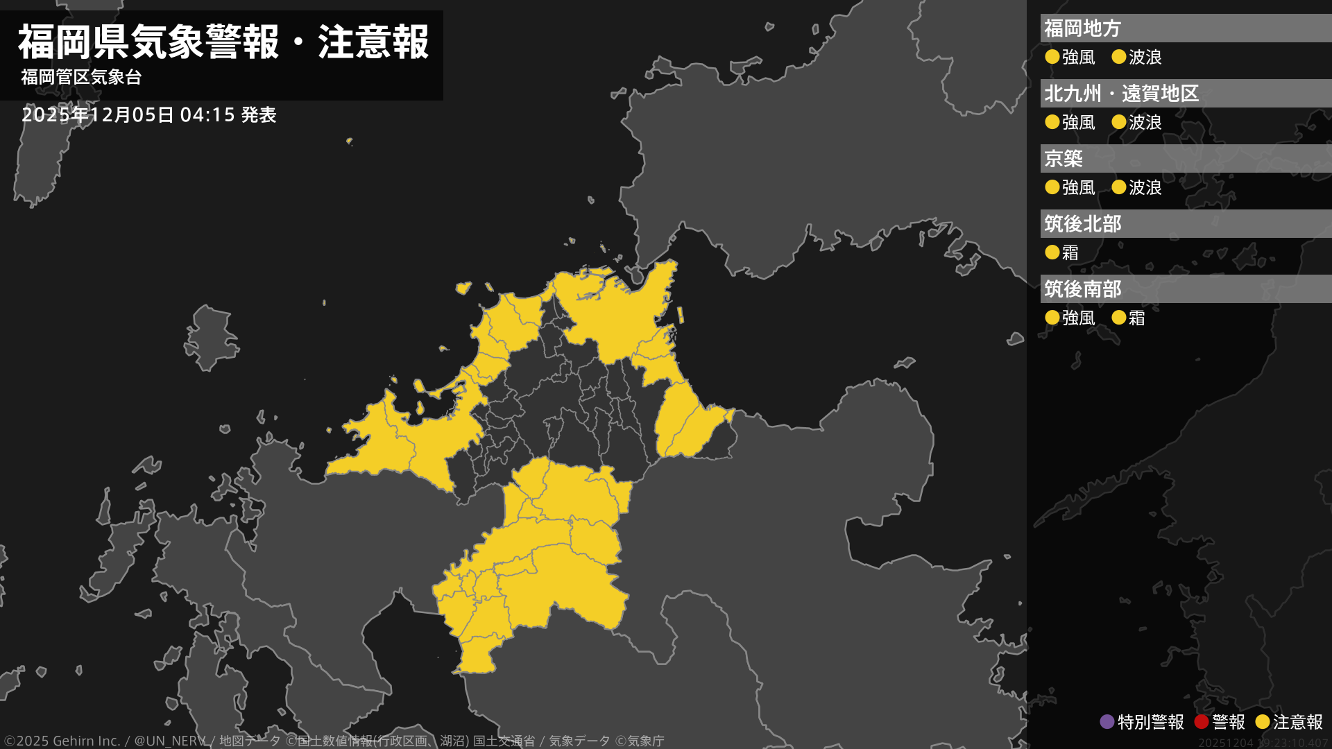 【福岡県 気象警報・注意報 2025年12月05日 04:23】福岡、北九州、筑後地方では、強風に注意してください。福岡、北九州地方では、高波に注意してください。筑後地方では、霜に対する農作物の管理に注意してください。#気象警報注意報 #福岡県