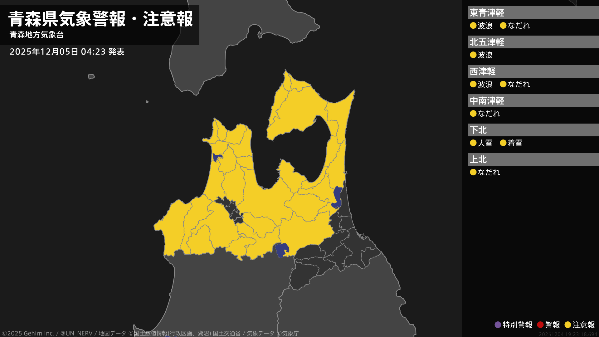 【青森県 気象警報・注意報 2025年12月05日 04:23】下北では、大雪や電線等への着雪に注意してください。津軽では、高波に注意してください。津軽、三八上北では、なだれに注意してください。#気象警報注意報 #青森県