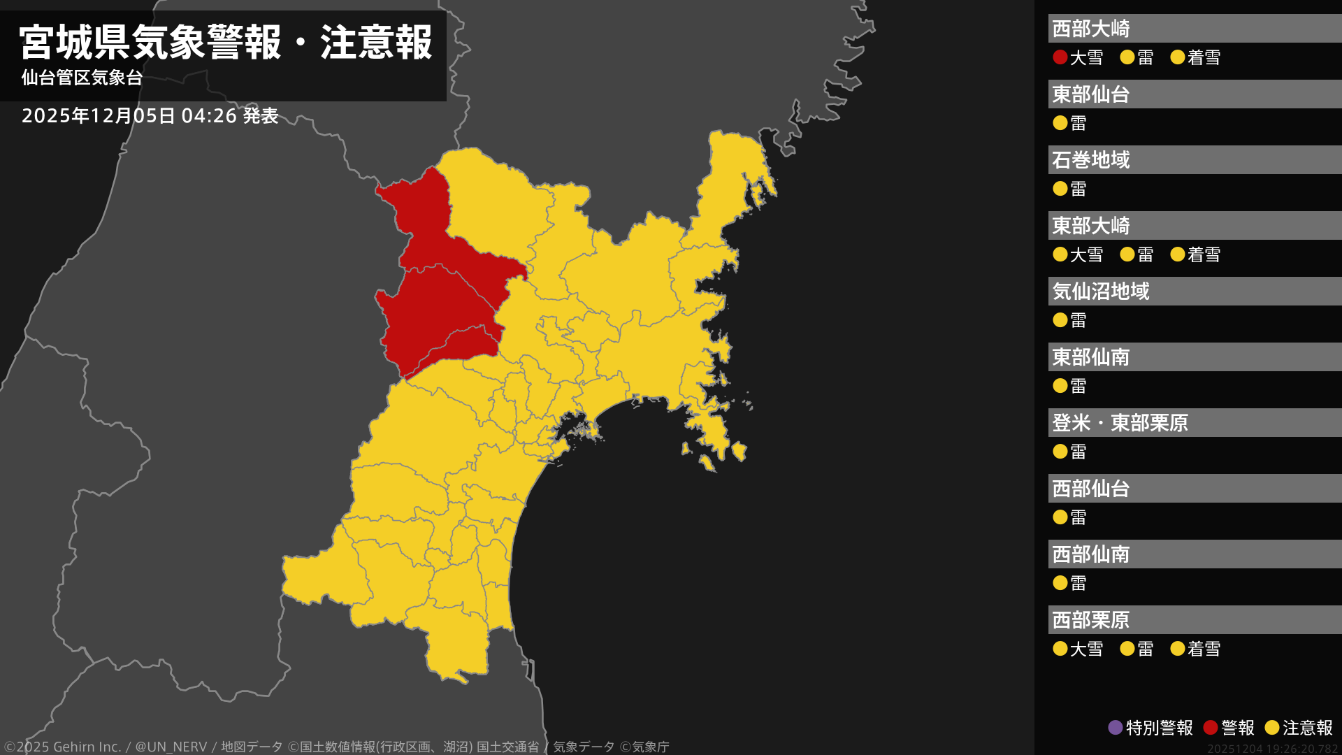 【宮城県 気象警報・注意報 2025年12月05日 04:26】西部では、5日昼前まで大雪に警戒してください。#気象警報注意報 #宮城県