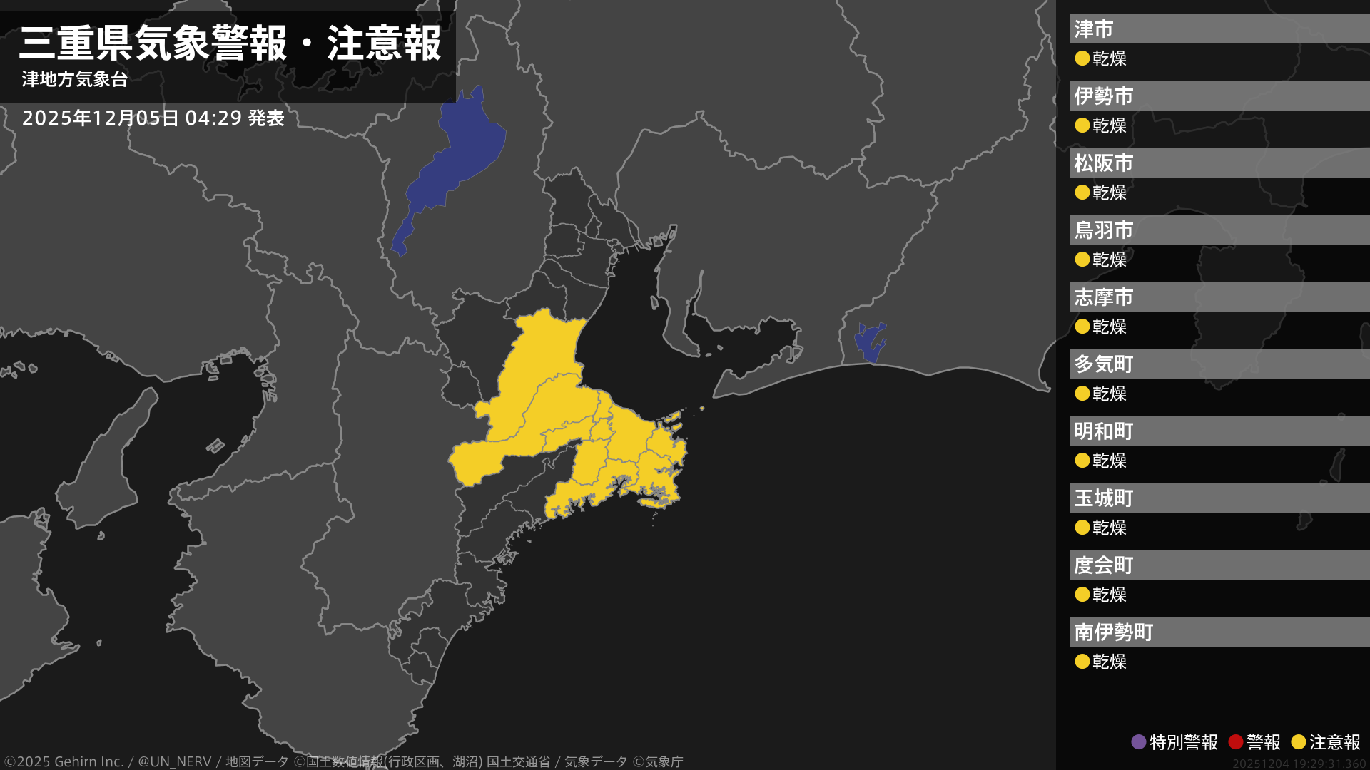 【三重県 気象警報・注意報 2025年12月05日 04:29】三重県では、5日まで空気の乾燥した状態が続くため、火の取り扱いに注意してください。#気象警報注意報 #三重県