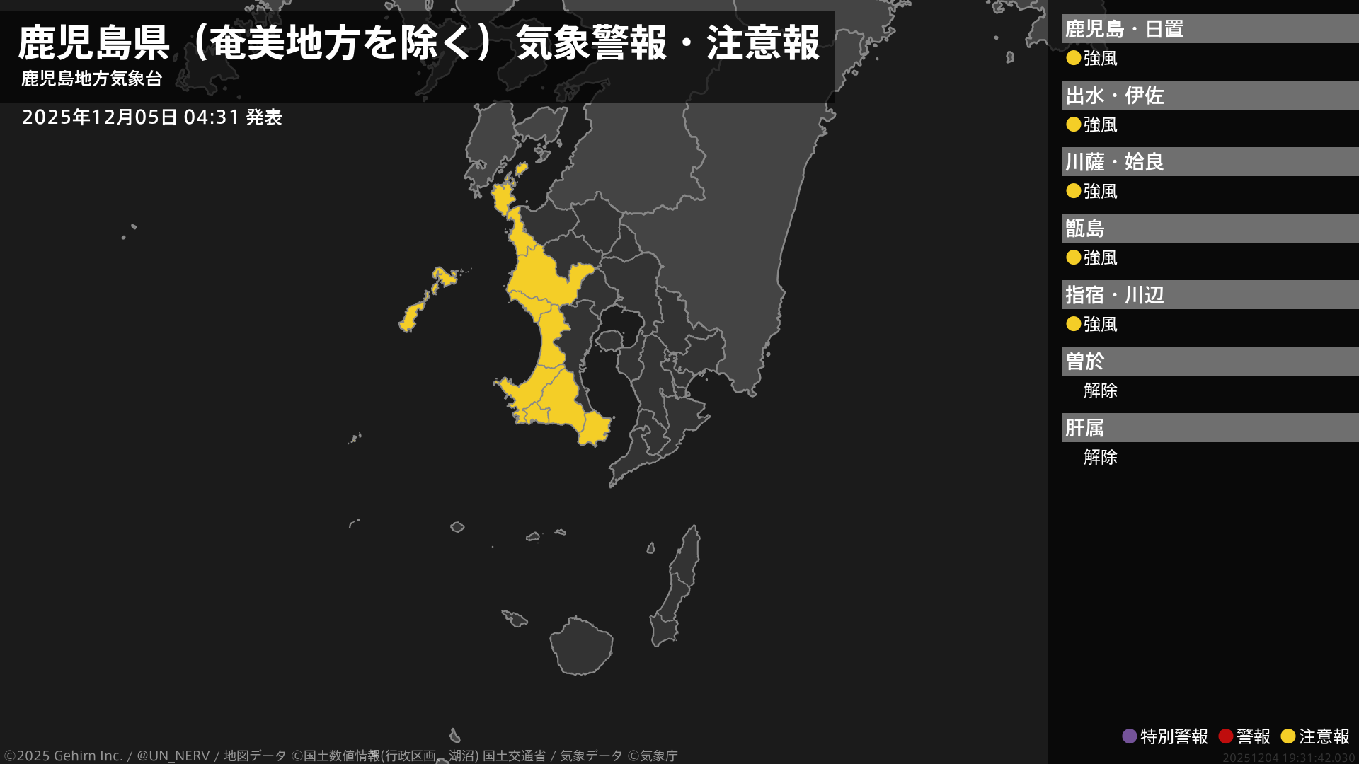 【鹿児島県(奄美地方を除く) 気象警報・注意報 2025年12月05日 04:31】薩摩地方では、5日夕方まで強風に注意してください。#気象警報注意報 #鹿児島県(奄美地方除く)