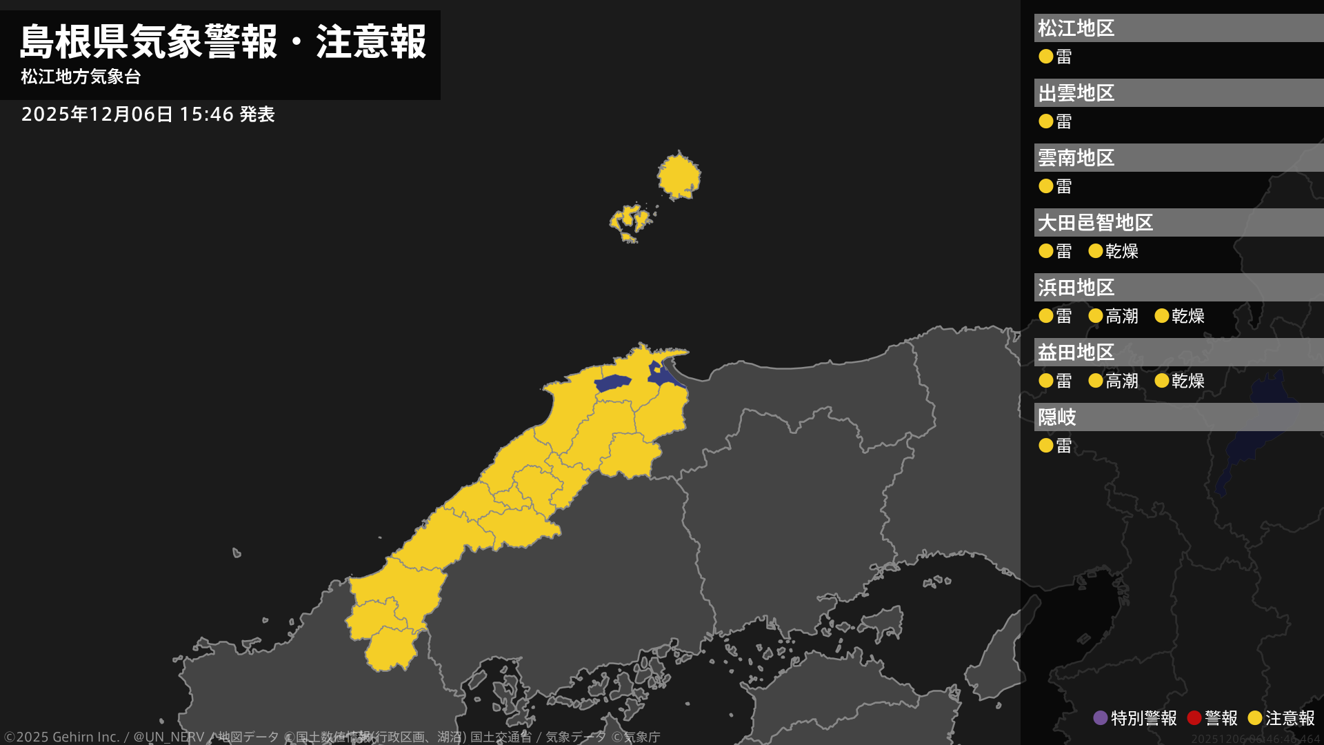 【島根県 気象警報・注意報 2025年12月06日 15:46】西部では、高潮と、空気の乾燥した状態が続くため火の取り扱いに注意してください。島根県では、竜巻などの激しい突風や急な強い雨、落雷に注意してください。#気象警報注意報 #島根県