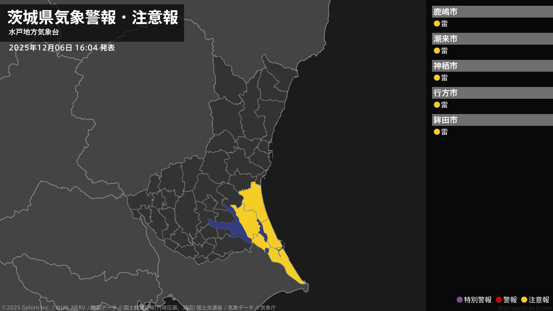 【茨城県 気象警報・注意報 2025年12月06日 16:04】南部では、6日夜のはじめ頃から6日夜遅くまで急な強い雨や落雷に注意してください。#気象警報注意報 #茨城県