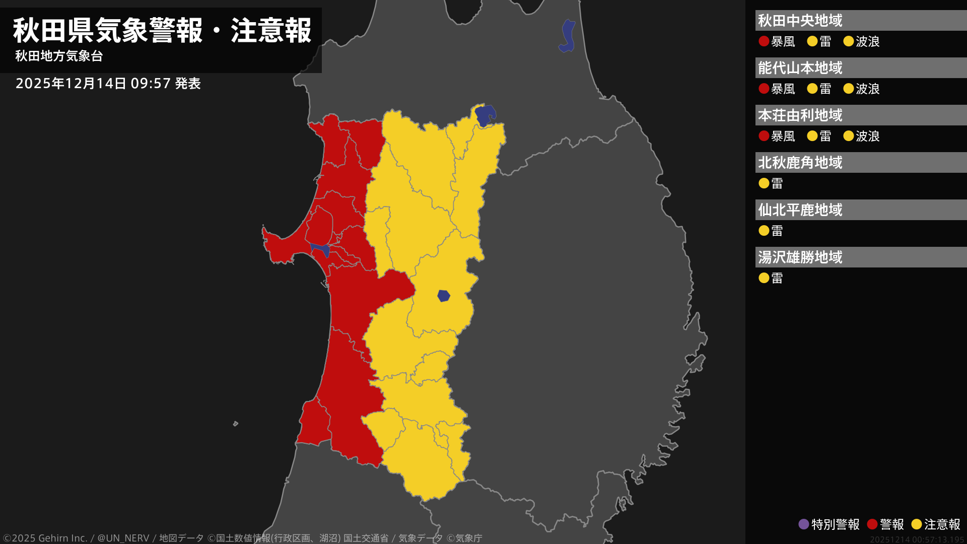 【秋田県 気象警報・注意報 2025年12月14日 09:57】沿岸では、14日夕方から15日朝まで暴風に警戒してください。#気象警報注意報 #秋田県