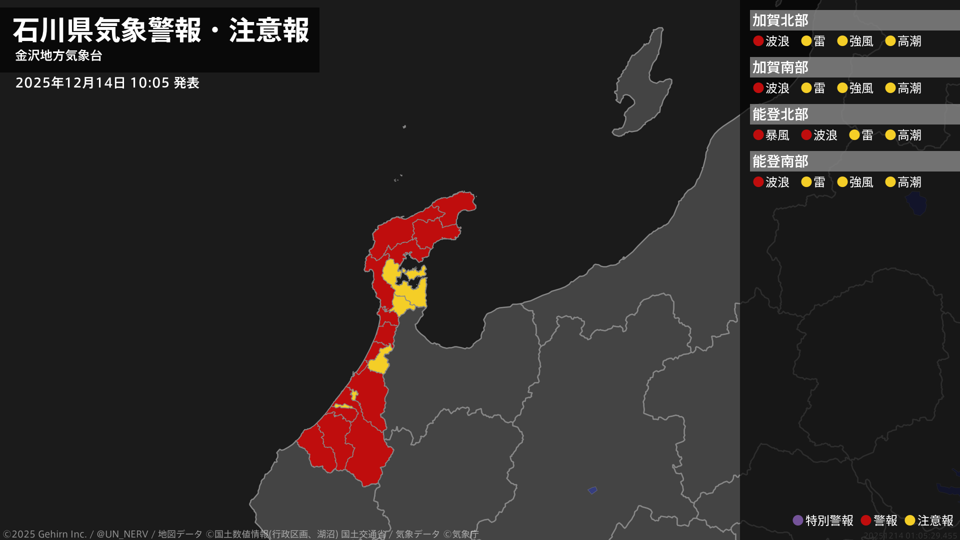 【石川県 気象警報・注意報 2025年12月14日 10:05】能登の海上では、14日夕方から14日夜遅くまで暴風に警戒してください。加賀では14日夕方から15日朝まで、能登では14日夕方から15日昼前まで、高波に警戒してください。#気象警報注意報 #石川県