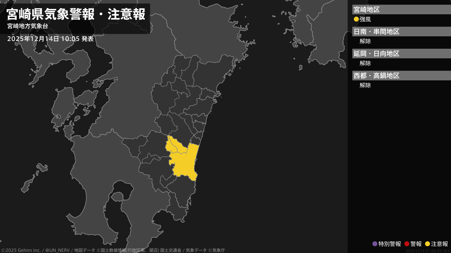 【宮崎県 気象警報・注意報 2025年12月14日 10:06】南部平野部では、14日夕方まで強風に注意してください。#気象警報注意報 #宮崎県