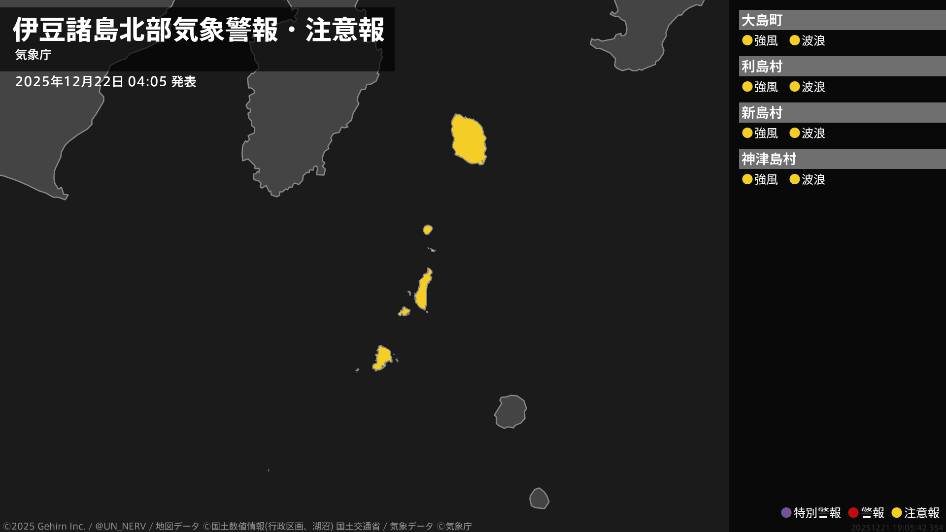 【東京都 気象警報・注意報 2025年12月22日 04:05】東京地方、伊豆諸島北部、伊豆諸島南部では、強風に注意してください。東京都では、高波に注意してください。小笠原諸島では、急な強い雨や落雷に注意してください。#気象警報注意報 #東京都