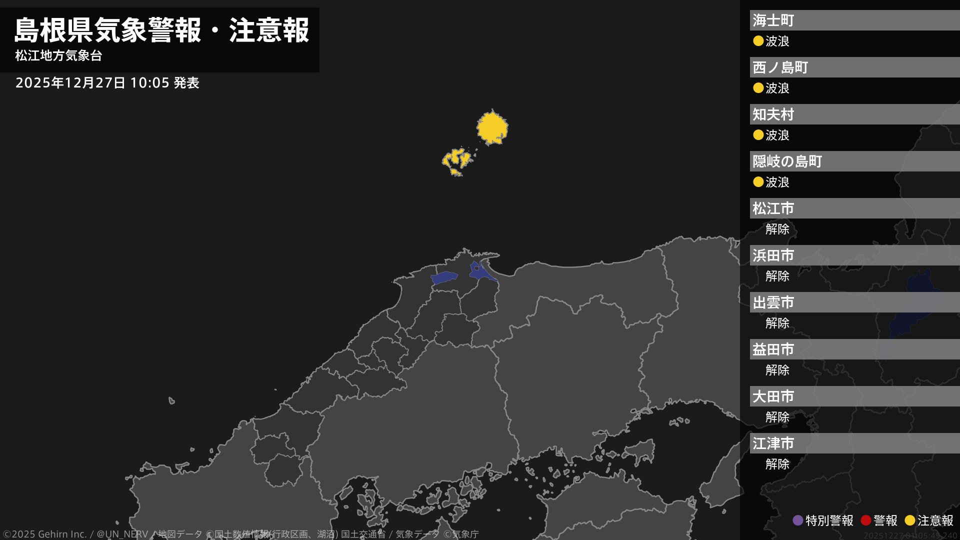 【島根県 気象警報・注意報 2025年12月27日 10:05】隠岐では、27日夕方まで高波に注意してください。#気象警報注意報 #島根県