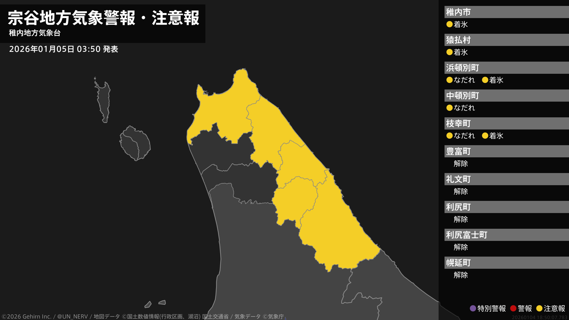 【宗谷地方 気象警報・注意報 2026年01月05日 03:50】宗谷地方では、5日までなだれに、6日明け方まで着氷に注意してください。#気象警報注意報 #宗谷地方