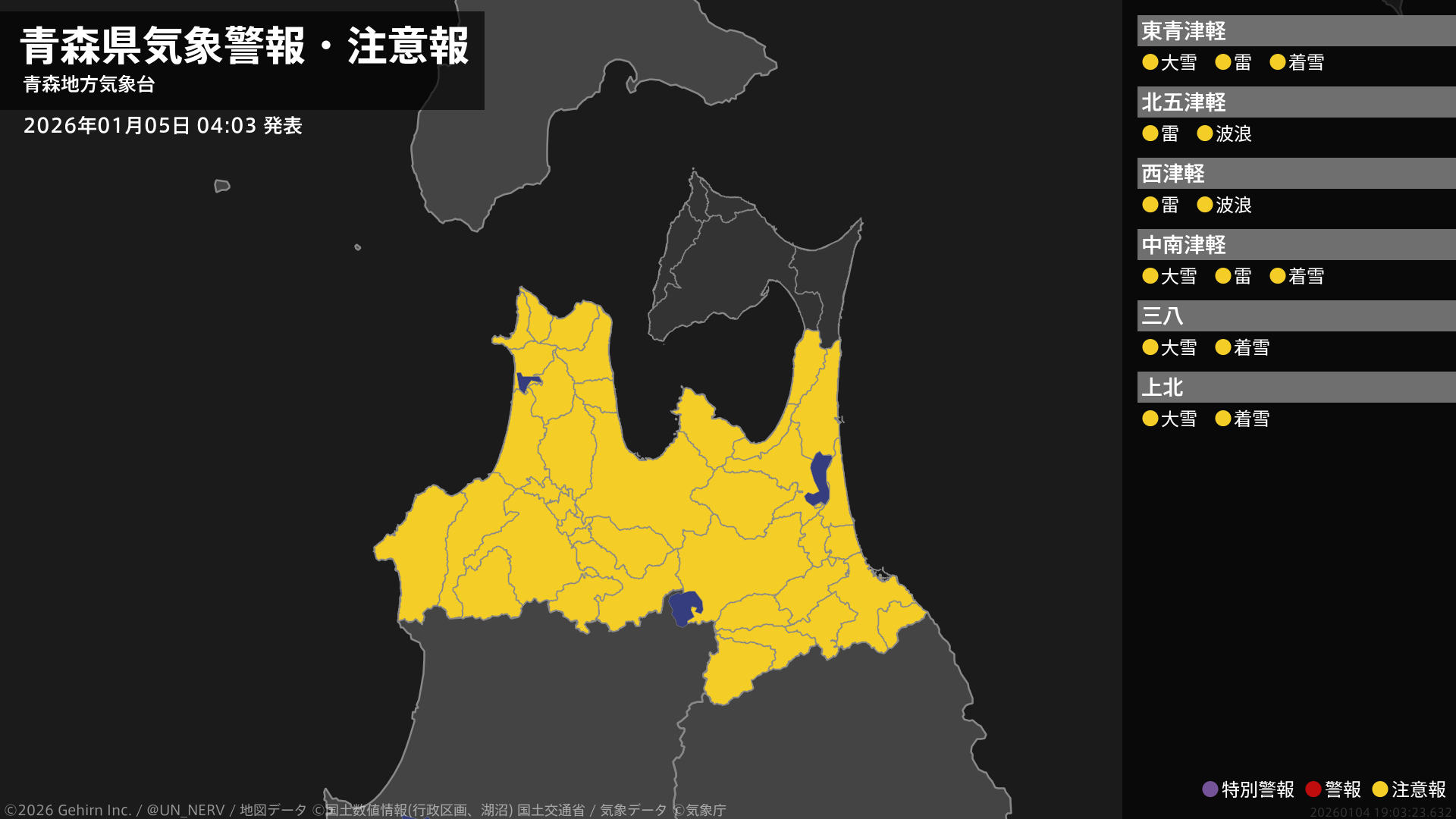 【青森県 気象警報・注意報 2026年01月05日 01:52】津軽、三八上北では、大雪や電線等への着雪に注意してください。津軽では、高波や落雷に注意してください。#気象警報注意報 #青森県