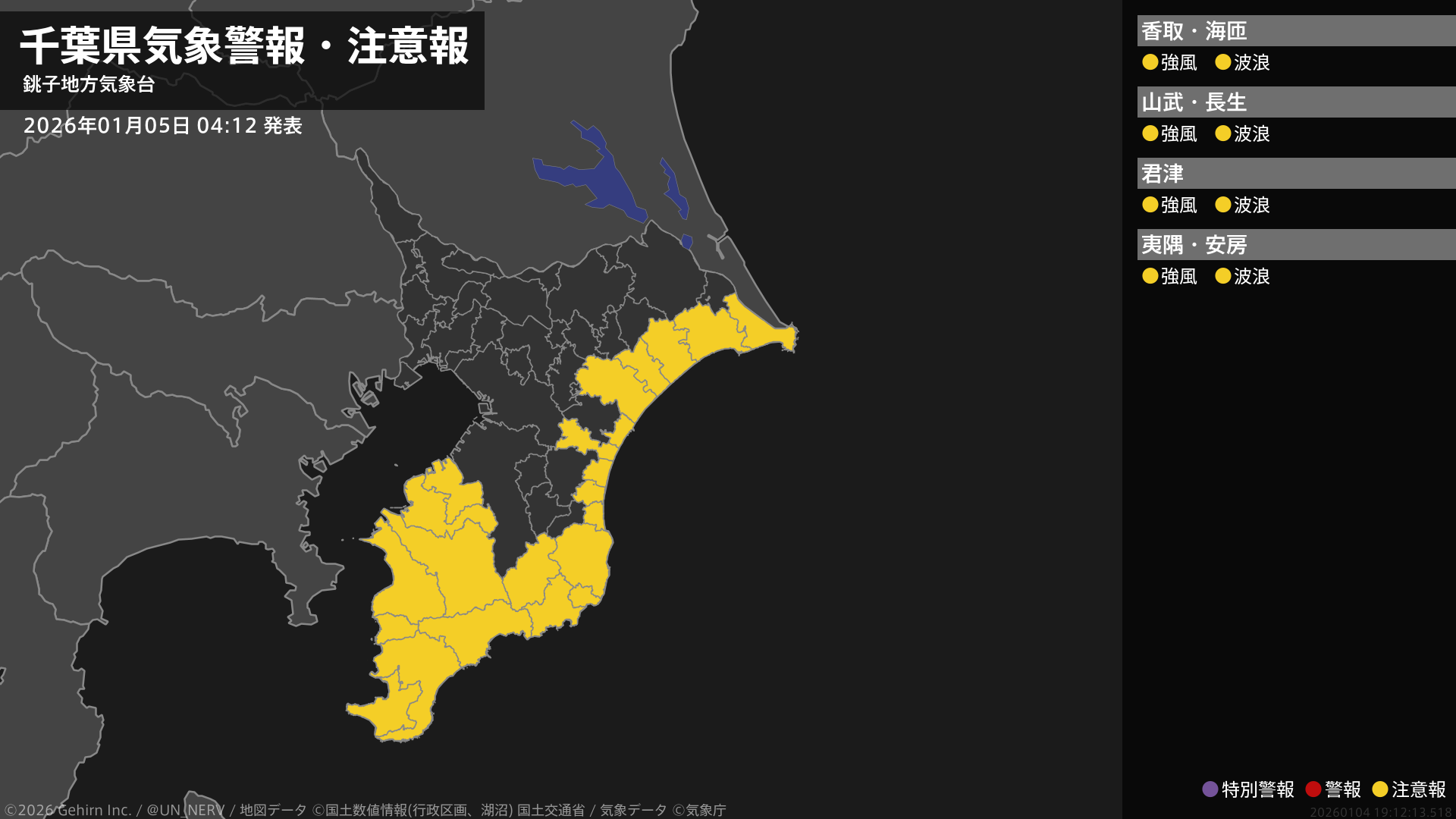 【千葉県 気象警報・注意報 2026年01月05日 04:12】南部では5日夜遅くまで、北東部では5日昼前から5日夕方まで、強風や高波に注意してください。#気象警報注意報 #千葉県