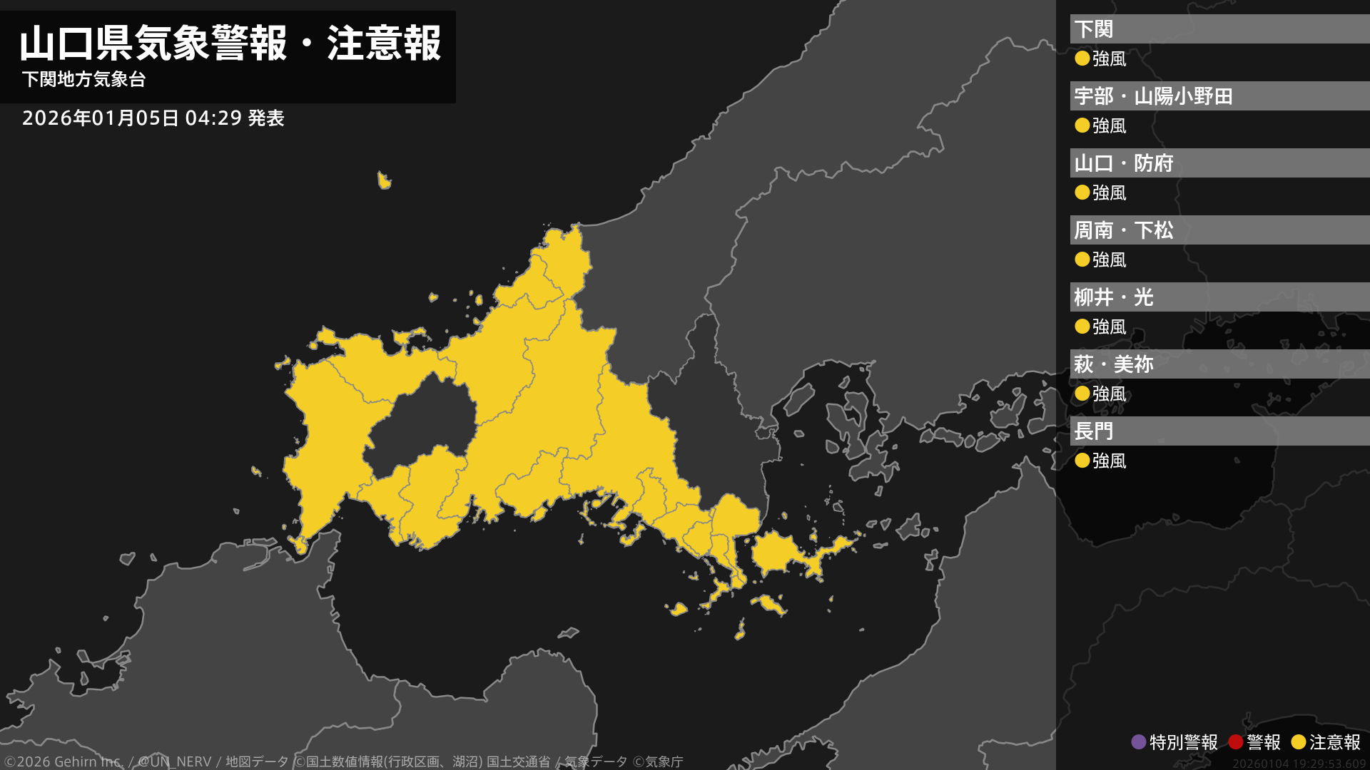 【山口県 気象警報・注意報 2026年01月05日 04:29】中部では5日夜遅くまで、西部、東部、北部では6日明け方まで、強風に注意してください。#気象警報注意報 #山口県