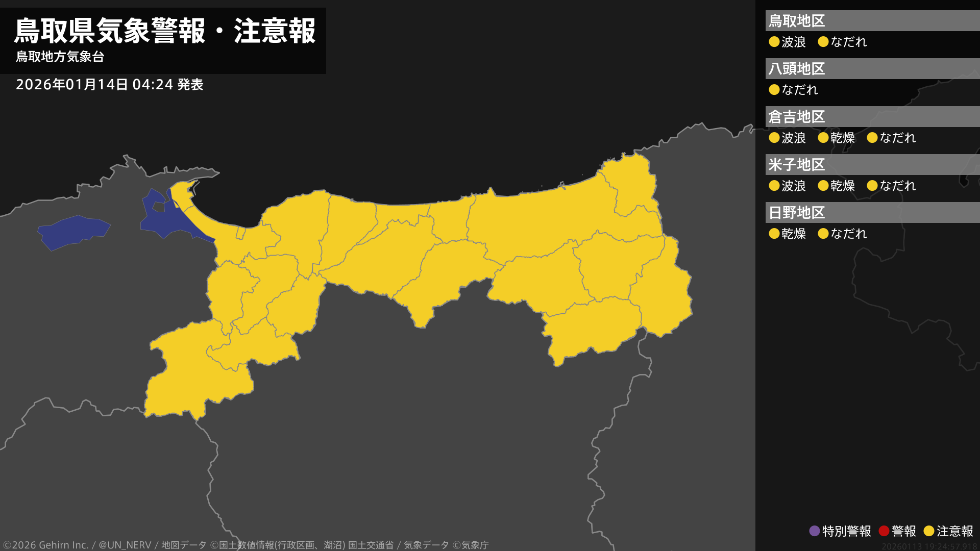 【鳥取県 気象警報・注意報 2026年01月14日 04:24】鳥取県では、14日夜遅くまで高波に、15日までなだれに注意してください。中・西部では、14日まで空気の乾燥した状態が続くため、火の取り扱いに注意してください。#気象警報注意報 #鳥取県