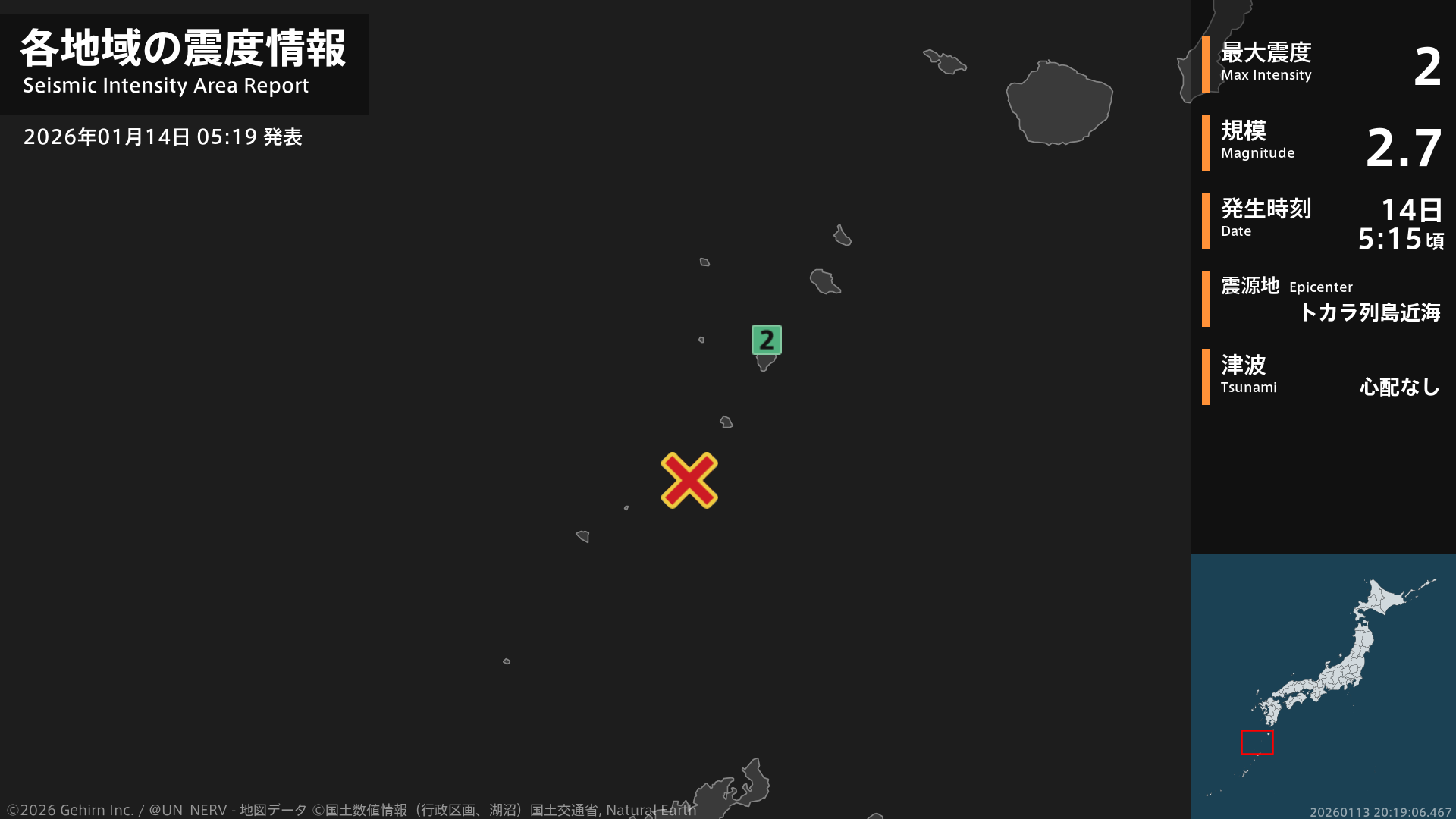 【地震情報 2026年1月14日】5時15分頃、トカラ列島近海を震源とする地震がありました。震源の深さは約20km、地震の規模はM2.7、最大震度2を鹿児島県で観測しています。この地震による津波の心配はありません。#地震 #鹿児島県