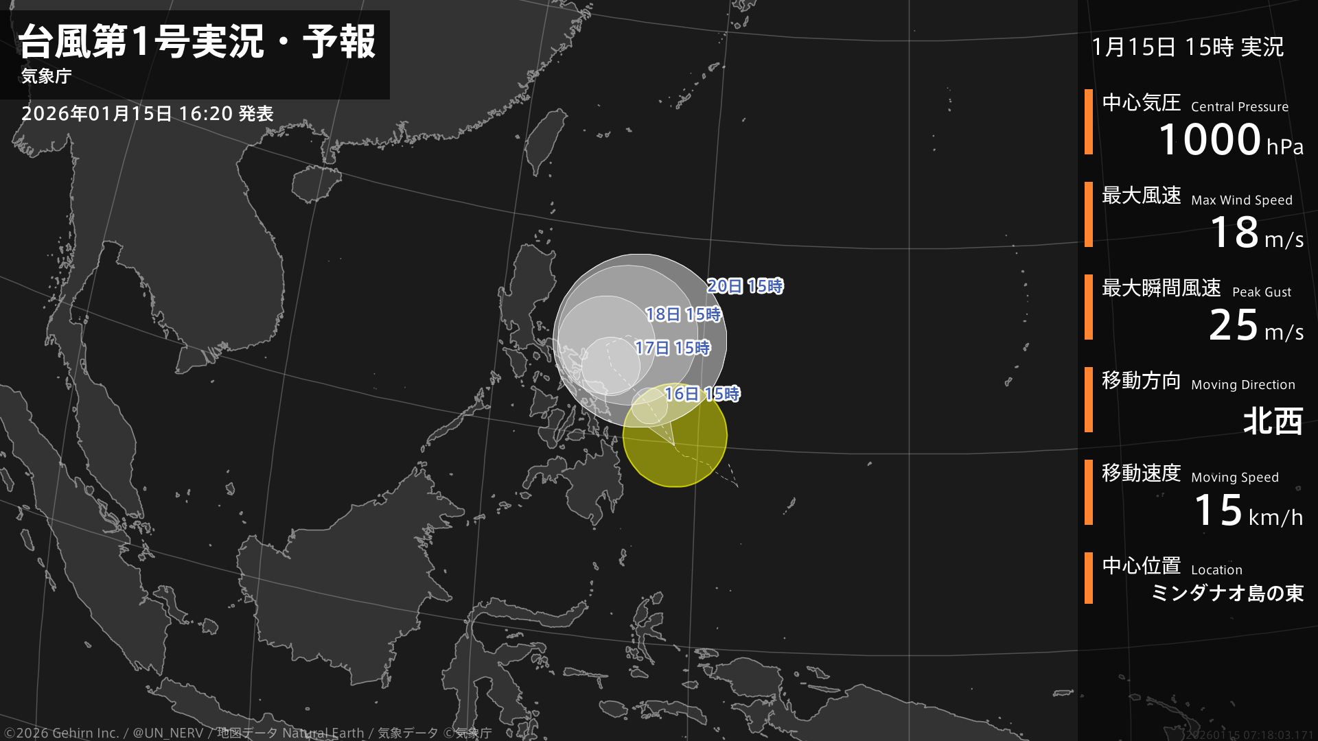【台風第1号実況・予報 2026年01月15日 16:18】台風第1号(ノケーン)が発生しました。#台風情報