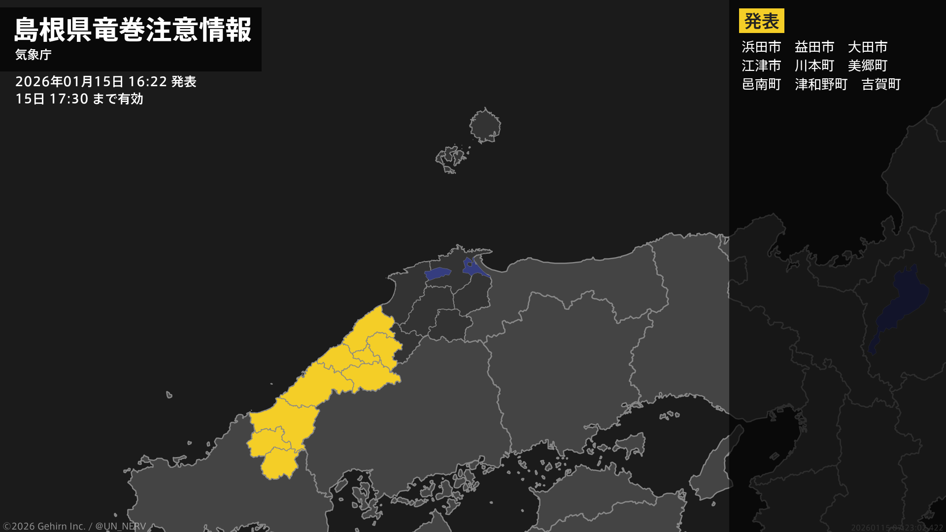 【島根県 竜巻注意情報】島根県は、竜巻などの激しい突風が発生しやすい気象状況になっています。頑丈な建物内に移動するなど安全確保に努めてください。この情報は15日17:30まで有効です。#竜巻注意情報 #島根県
