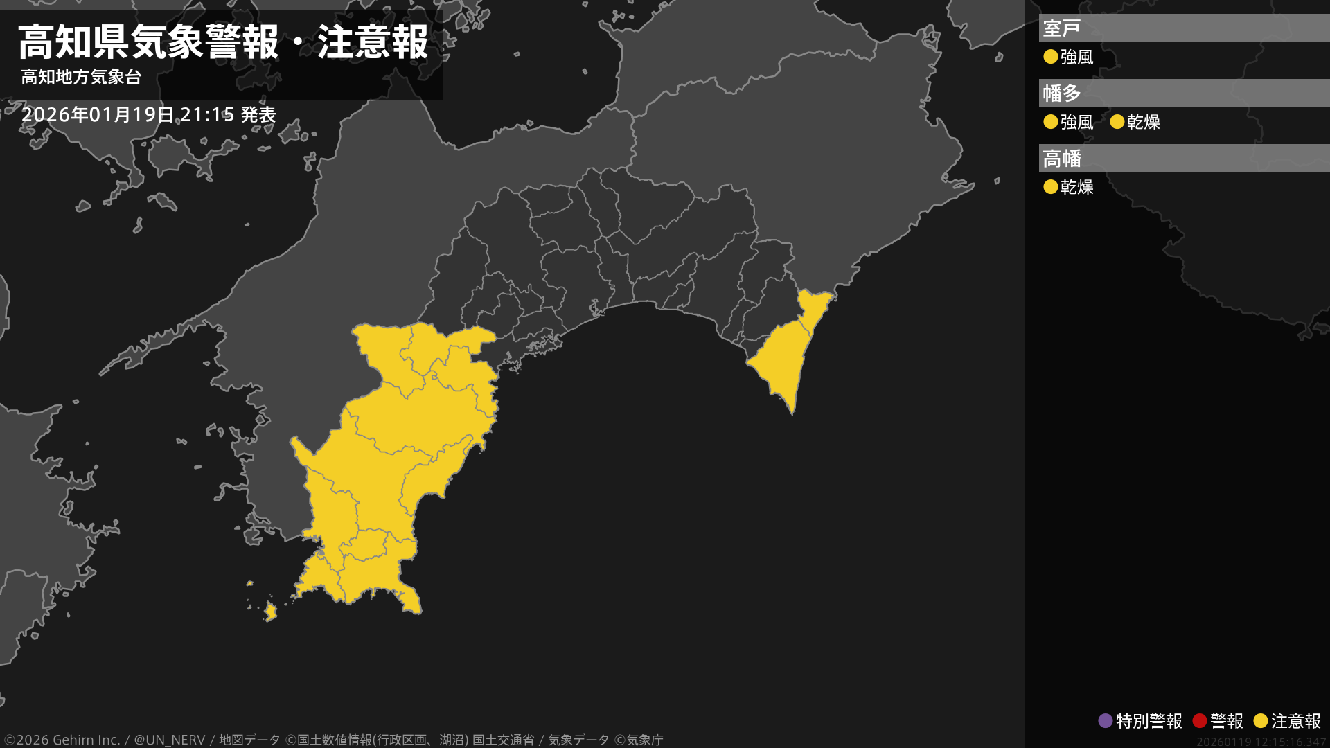【高知県 気象警報・注意報 2026年01月19日 21:15】西部では20日夕方まで、東部では20日朝から20日夜遅くまで、強風に注意してください。西部では、20日まで空気の乾燥した状態が続くため、火の取り扱いに注意してください。#気象警報注意報 #高知県