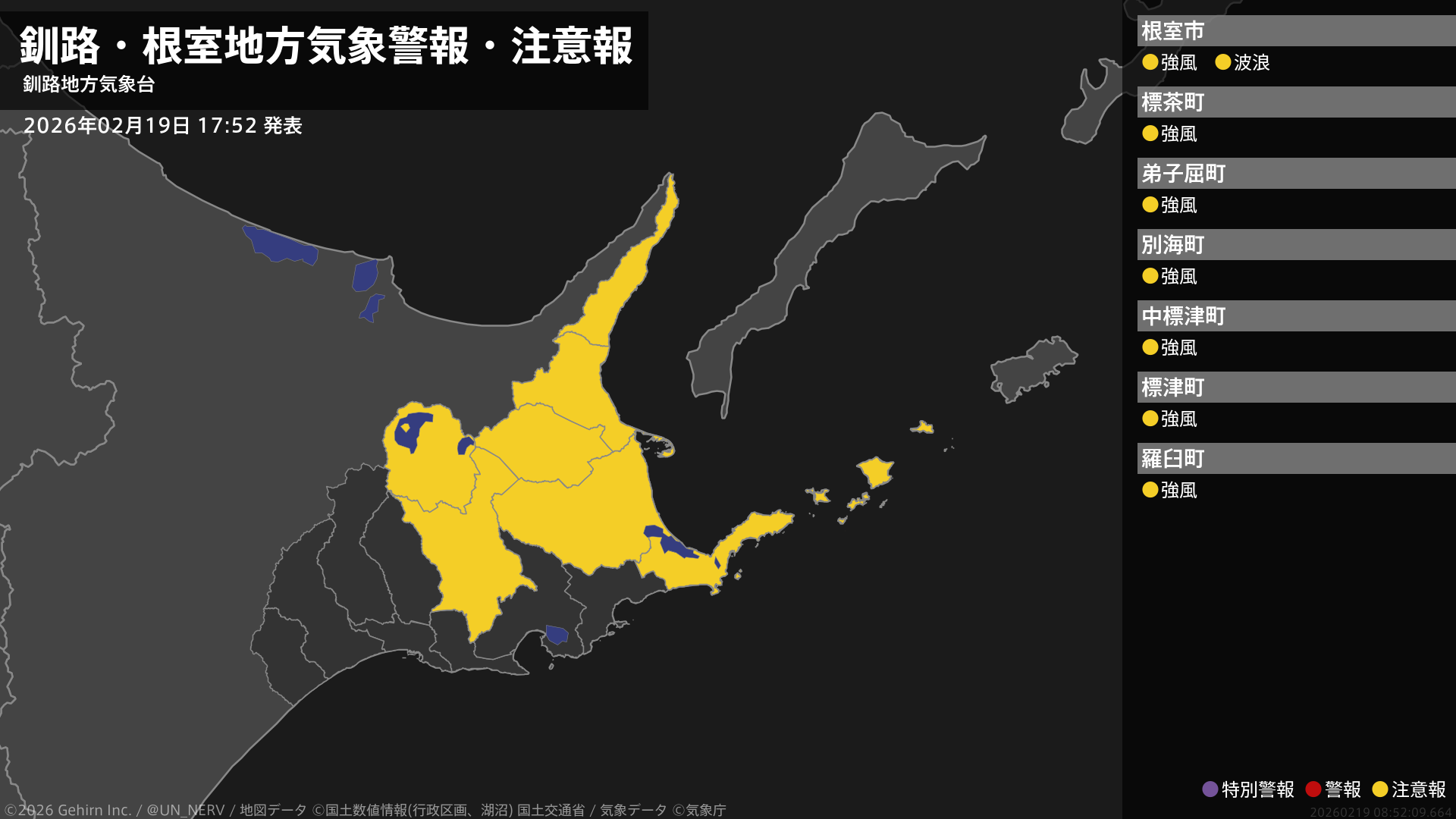 【釧路・根室地方 気象警報・注意報 2026年02月19日 17:52】根室、釧路地方では、20日明け方まで強風に注意してください。根室地方では、20日明け方まで高波に注意してください。#気象警報注意報 #根室地方 #釧路地方