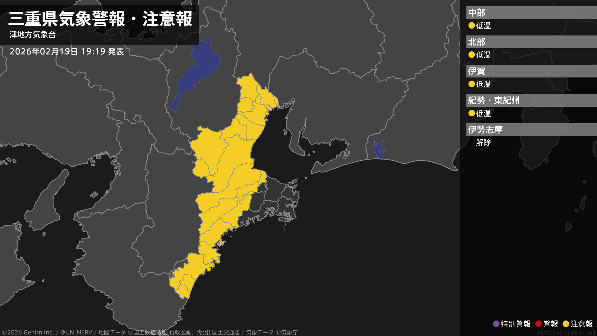 【三重県 気象警報・注意報 2026年02月19日 19:19】三重県では、20日まで低温に注意してください。#気象警報注意報 #三重県