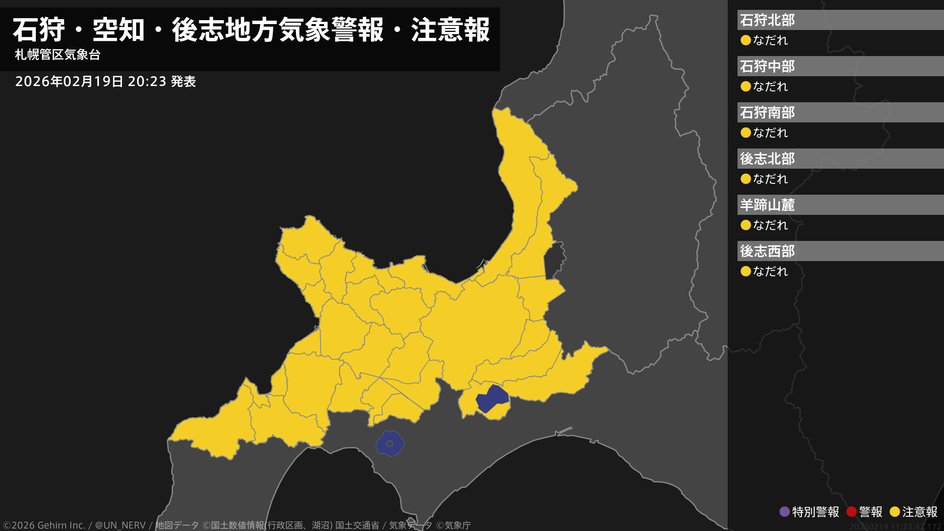 【石狩・空知・後志地方 気象警報・注意報 2026年02月19日 20:23】石狩、後志地方では、20日までなだれに注意してください。#気象警報注意報 #石狩地方 #後志地方