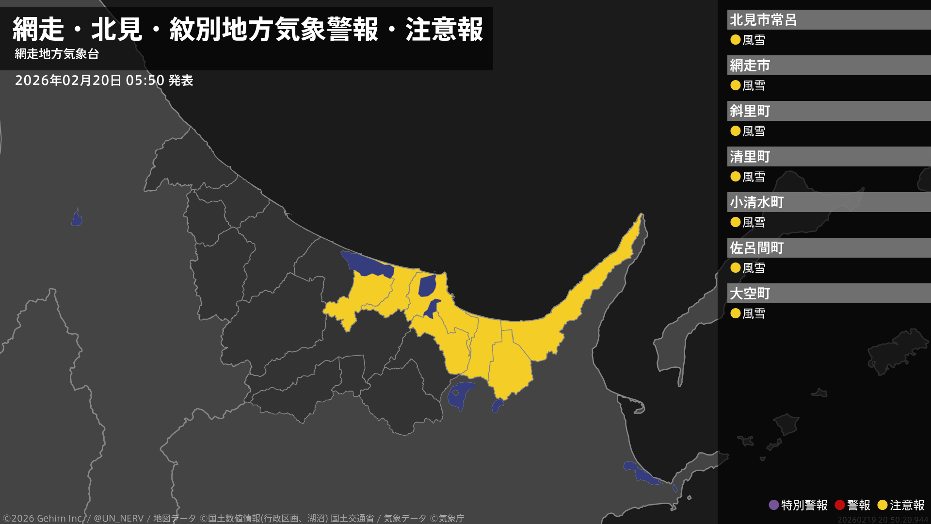 【網走・北見・紋別地方 気象警報・注意報 2026年02月20日 05:50】網走地方では、20日朝まで風雪に注意してください。#気象警報注意報 #網走・北見・紋別地方
