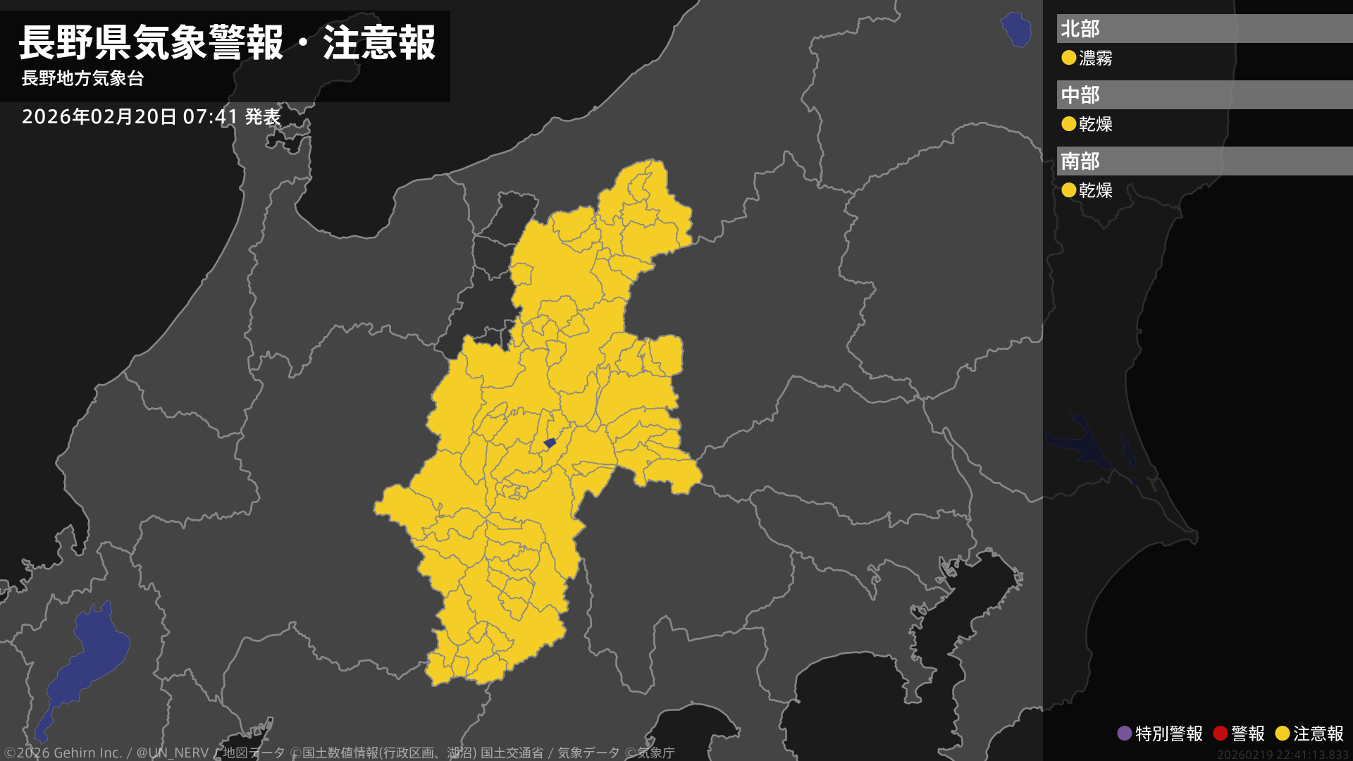 【長野県 気象警報・注意報 2026年02月20日 07:41】北部では、20日昼前まで濃霧による視程障害に注意してください。中部、南部では、21日まで空気の乾燥した状態が続くため、火の取り扱いに注意してください。#気象警報注意報 #長野県
