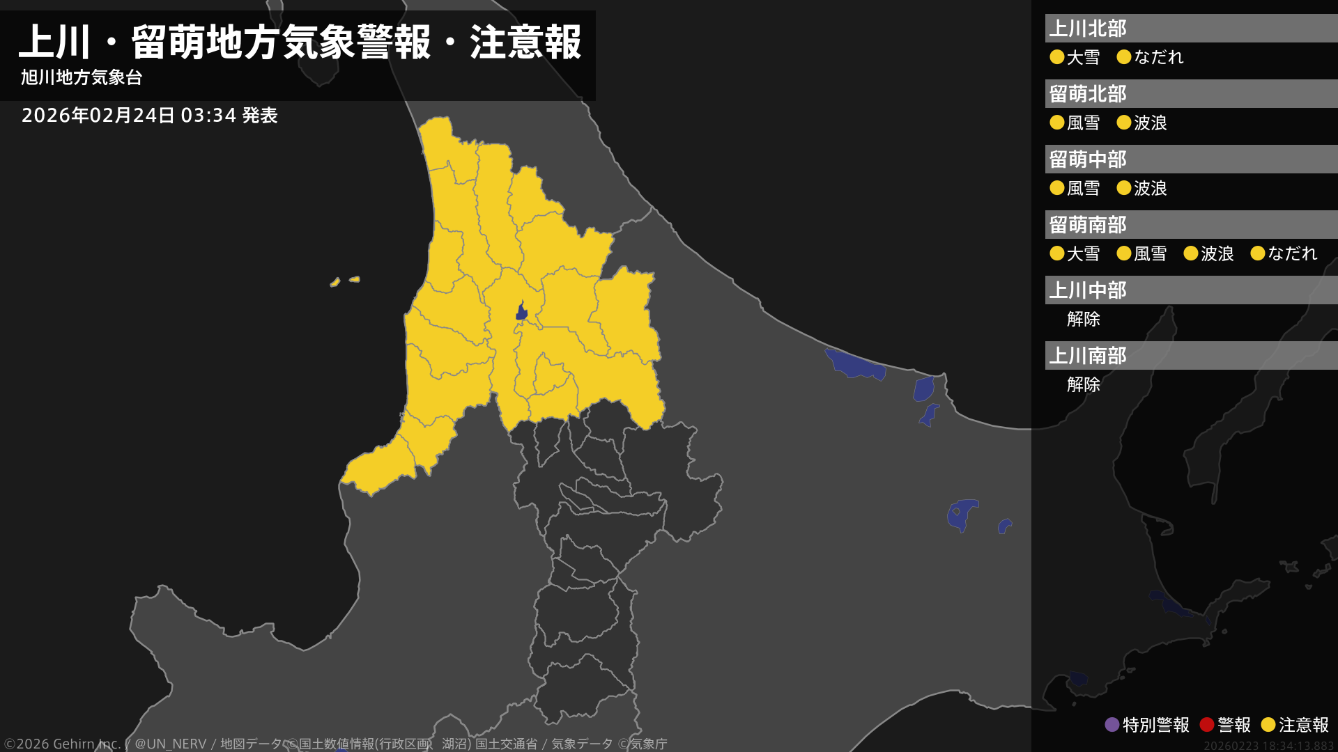 【上川・留萌地方 気象警報・注意報 2026年02月23日 23:50】