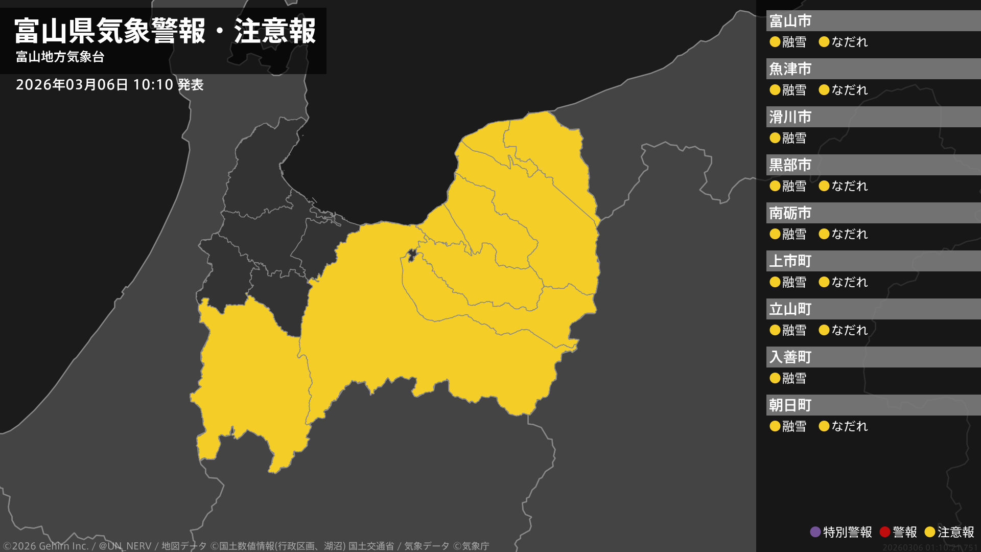 【富山県 気象警報・注意報 2026年03月06日 10:10】富山県では、6日夕方から7日明け方まで融雪による土砂災害に、7日までなだれに注意してください。#気象警報注意報 #富山県