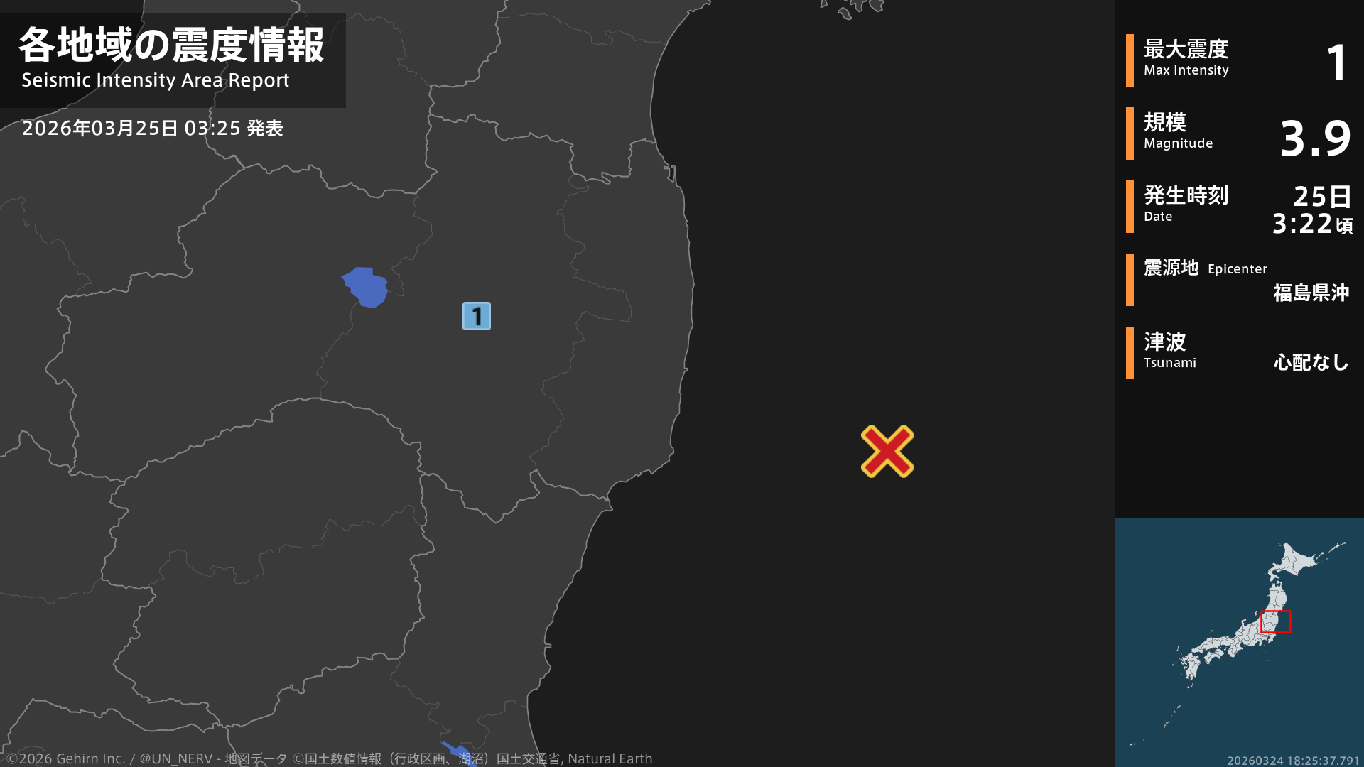 【地震情報 2026年3月25日】3時22分頃、福島県沖を震源とする地震がありました。震源の深さは約70km、地震の規模はM3.9、最大震度1を福島県で観測しています。この地震による津波の心配はありません。#地震 #福島県
