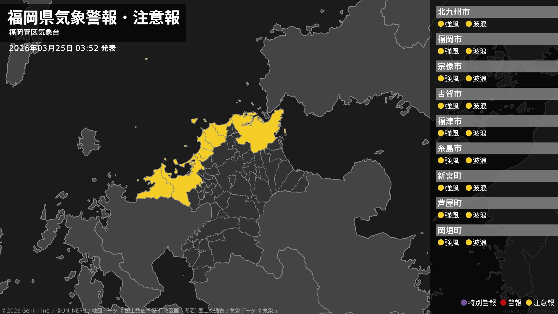 【福岡県 気象警報・注意報 2026年03月25日 03:52】福岡、北九州地方では、25日朝から25日夜のはじめ頃まで強風に、25日昼前から25日夜のはじめ頃まで高波に注意してください。#気象警報注意報 #福岡県