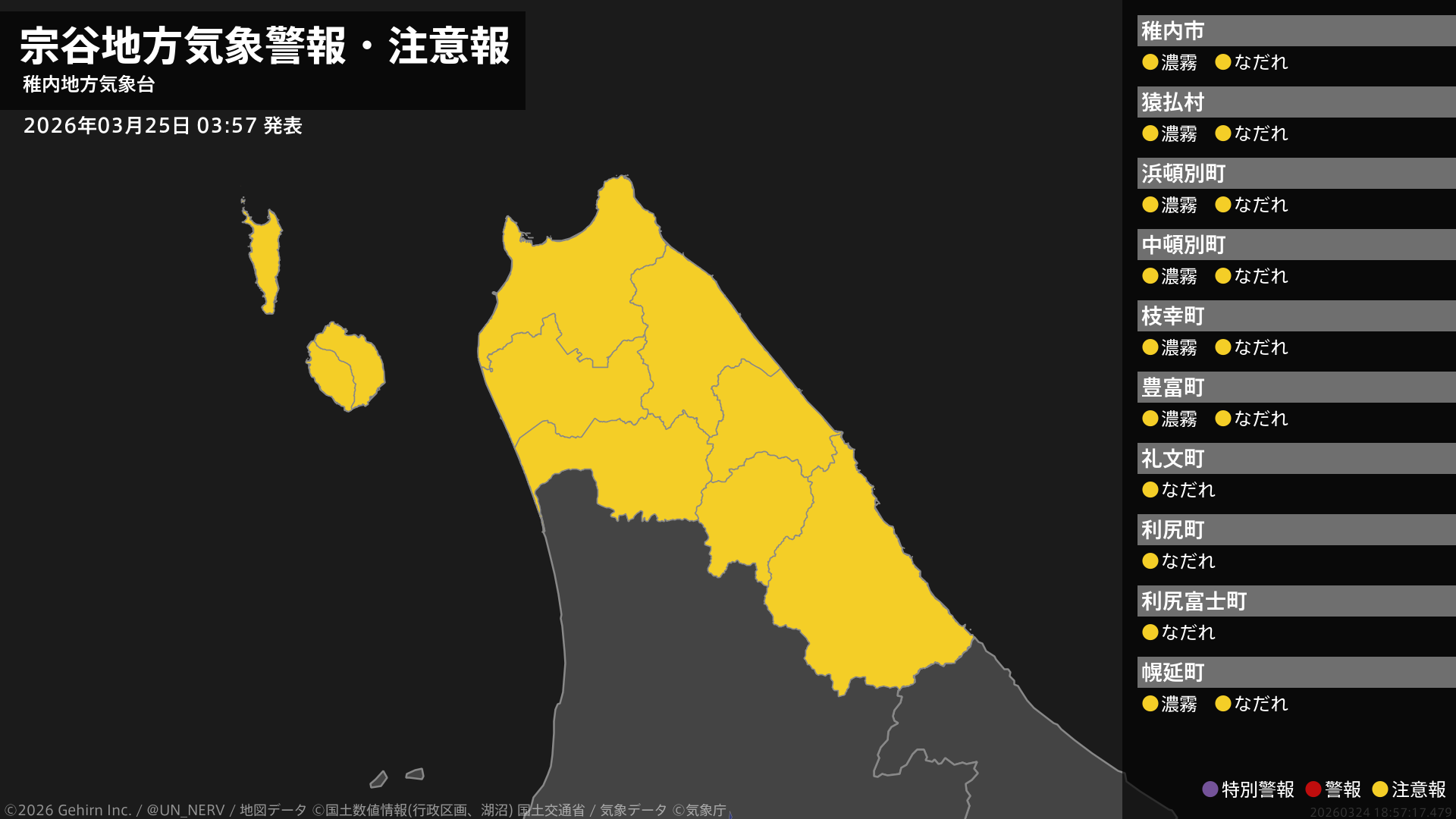 【宗谷地方 気象警報・注意報 2026年03月25日 03:57】宗谷地方では、25日昼前まで濃霧による視程障害に、26日までなだれに注意してください。#気象警報注意報 #宗谷地方