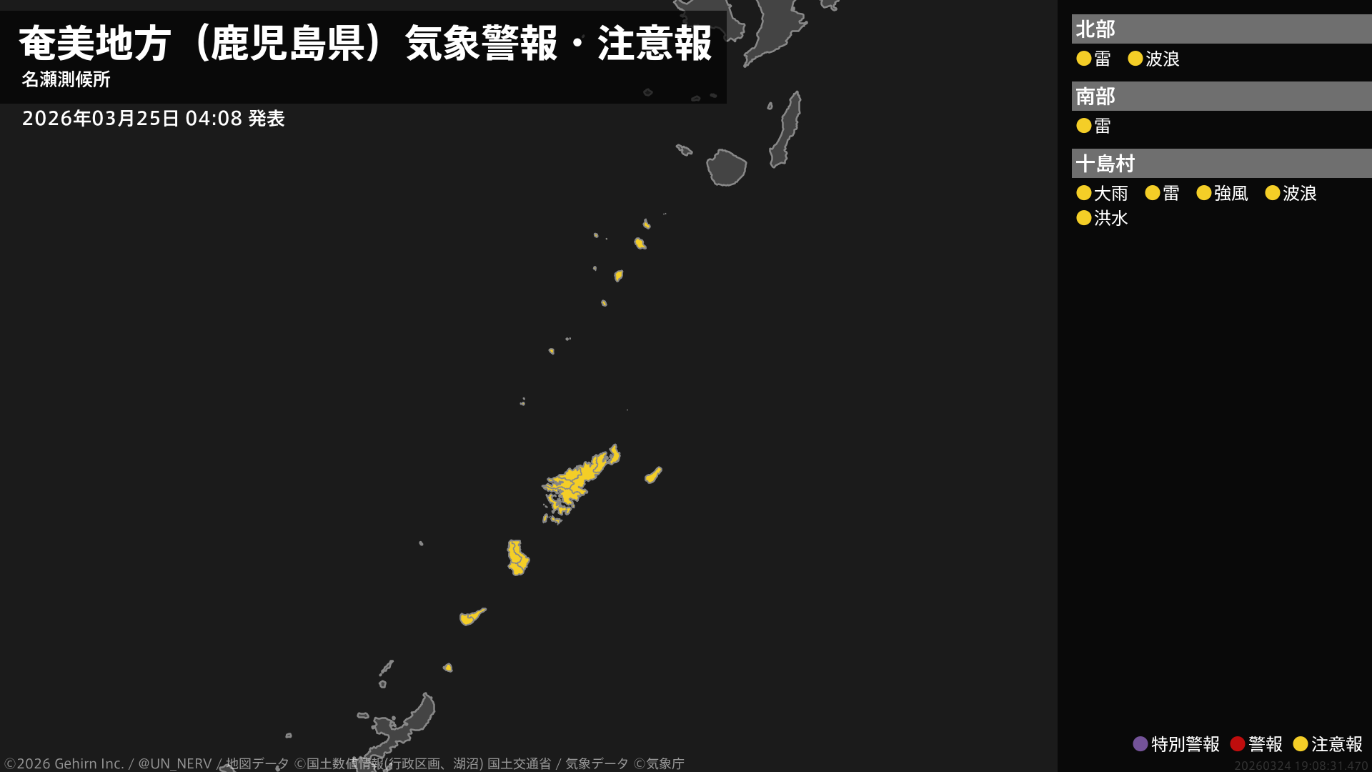 【奄美地方(鹿児島県) 気象警報・注意報 2026年03月25日 04:08】奄美地方では、土砂災害や河川の増水、強風、高波、竜巻などの激しい突風、落雷に注意してください。#気象警報注意報 #奄美地方